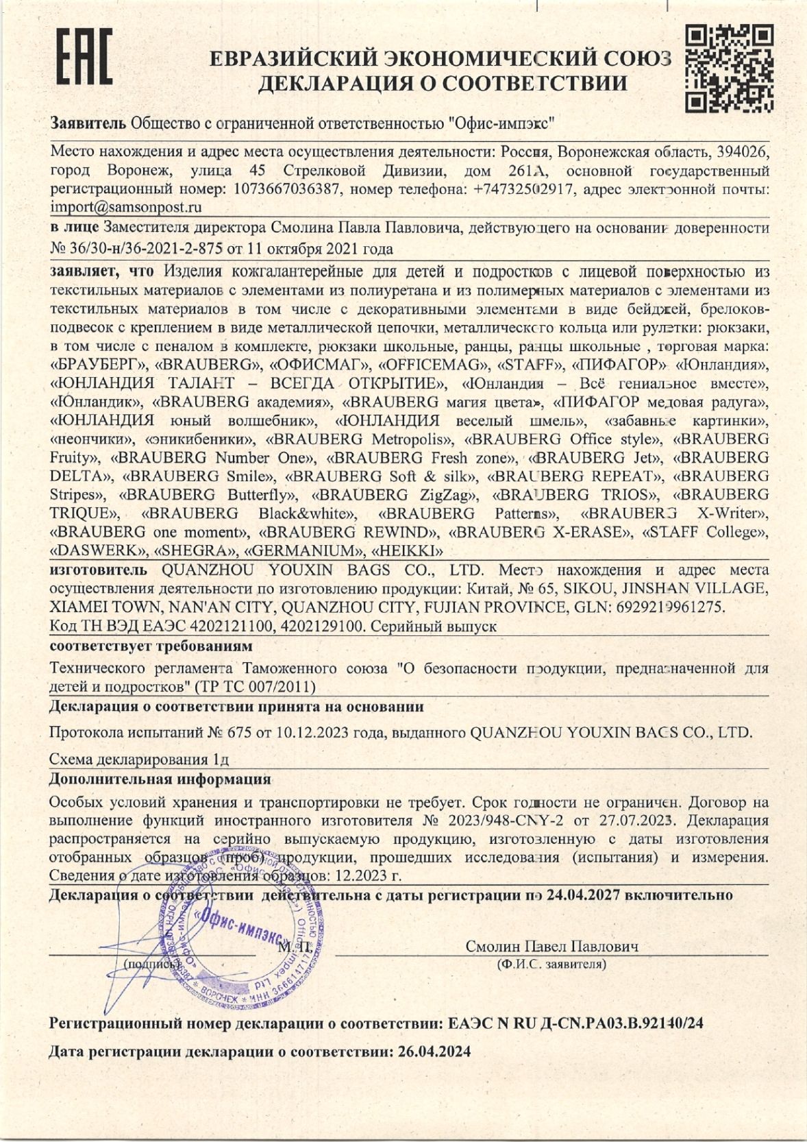 Рюкзак упакован в плотный ПЭТ-пакет с ручками и замком Zip Lock, который сохранит качество и товарный вид изделия при хранении и транспортировке.