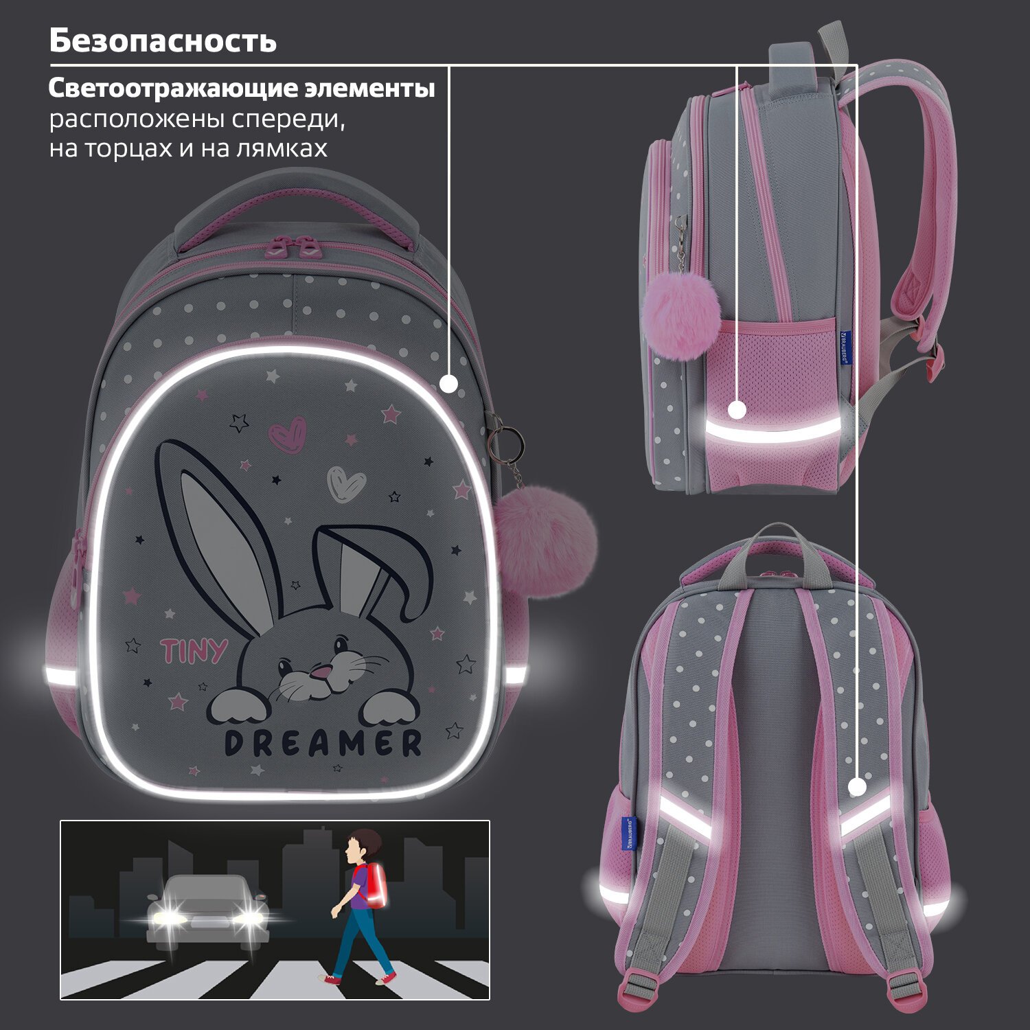 Светоотражающие элементы рюкзака расположены спереди, на торцах и на лямках. Они необходимы для безопасности пользователя в темное время суток.