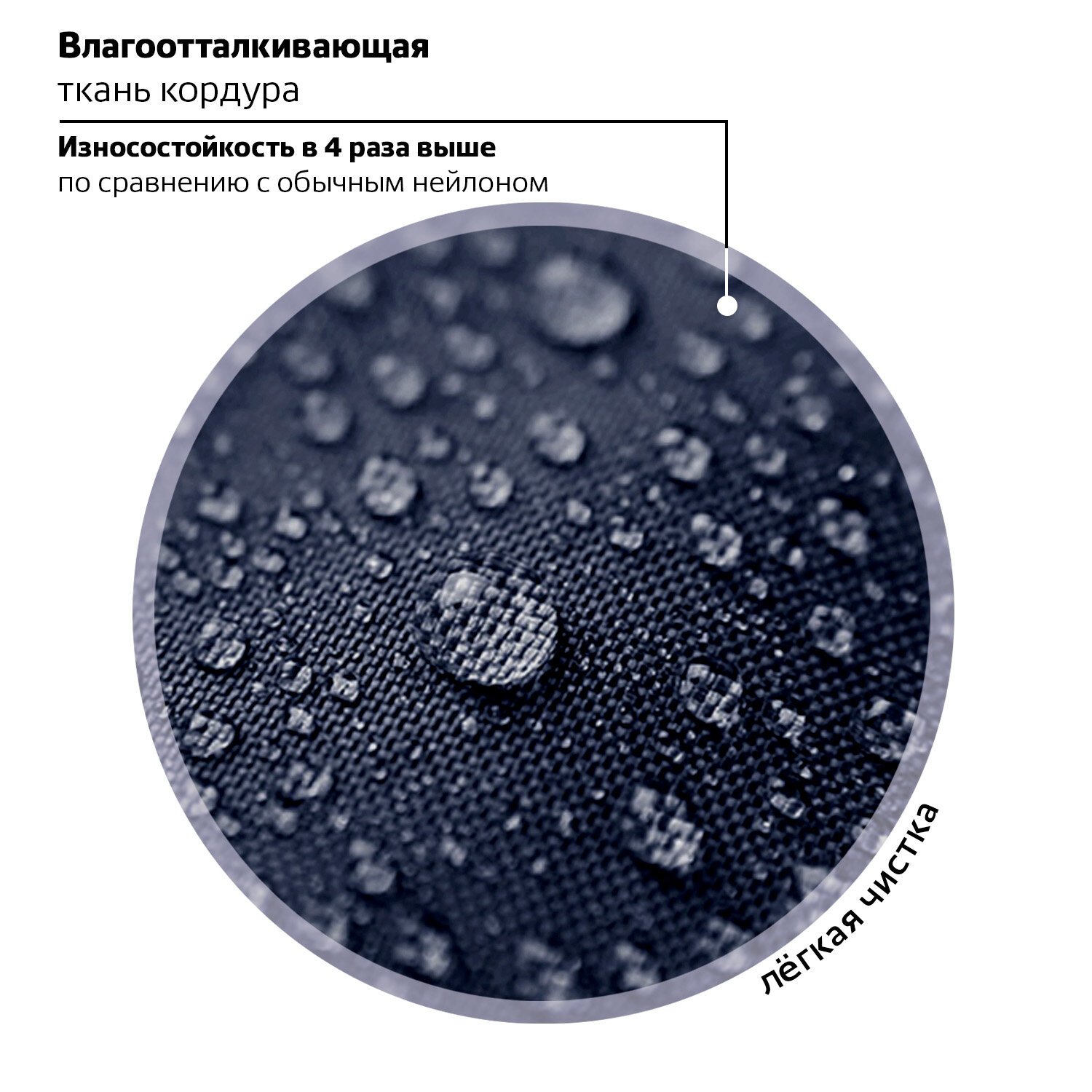 Рюкзак изготовлен из высококачественной влагоотталкивающей нейлоновой ткани – кордура, в которой за счёт особой структуры нити достигнута четырёхкратная стойкость к истиранию по сравнению с простым нейлоном. Ткань легко чистится.