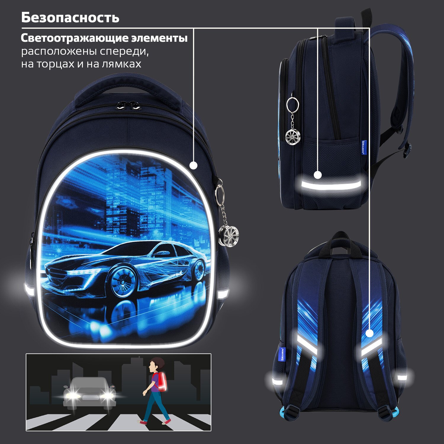 Рюкзак BRAUBERG OPTIMA, 2 отделения, с брелоком, "Night driver", 36х27х18 см, 272096