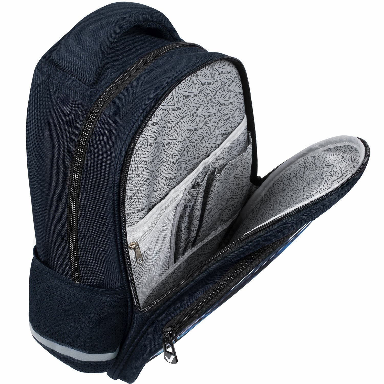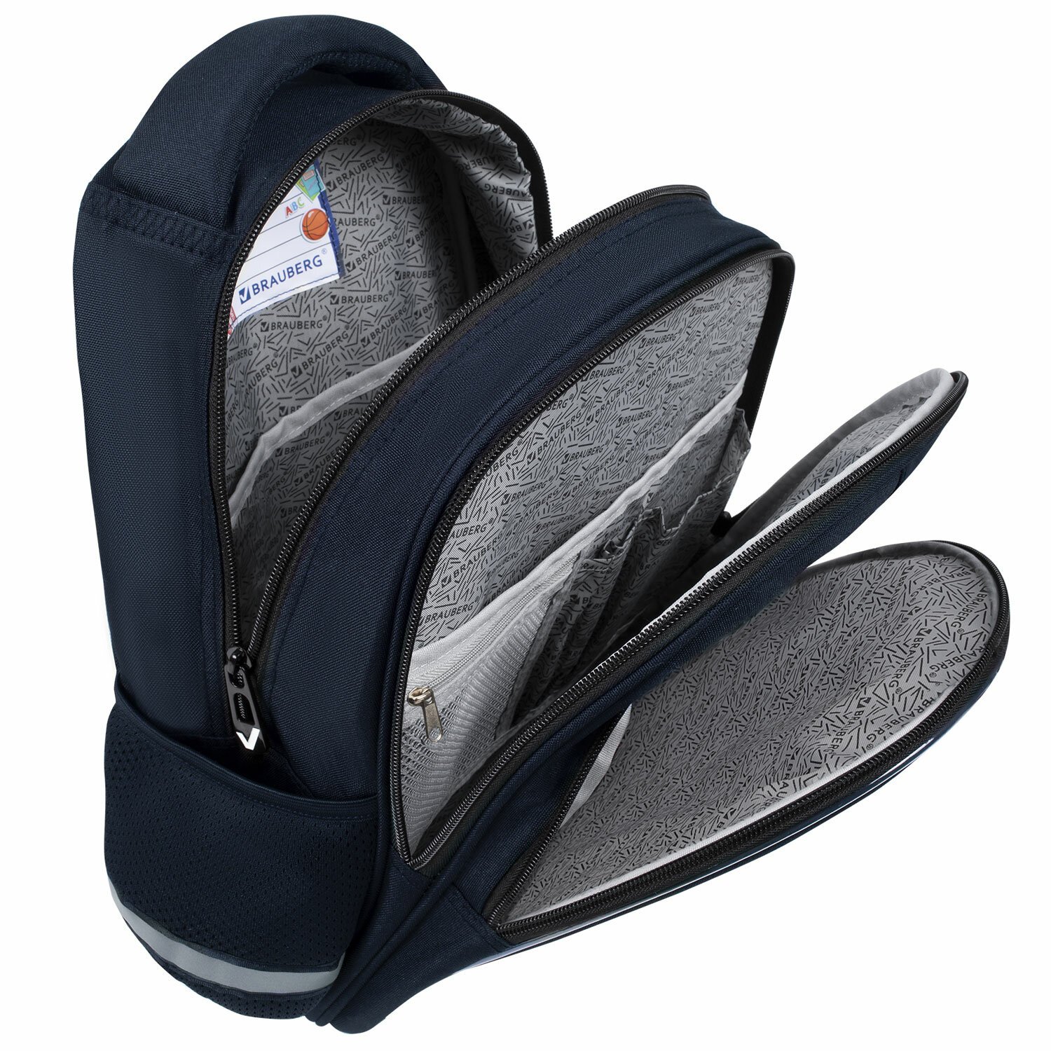 В основном отделении рюкзака можно легко и быстро разместить учебники и тетради формата А4+, воспользоваться дополнительным карманом. Также в основном отделении находится именная карточка школьника. Фронтальное отделение вмещает тетради и учебники формата А5, внутри находится органайзер для канцтоваров, карман для телефона и отделение из сетки на молнии. Такая организация пространства поможет держать принадлежности в сохранности и приучить ребенка к порядку.