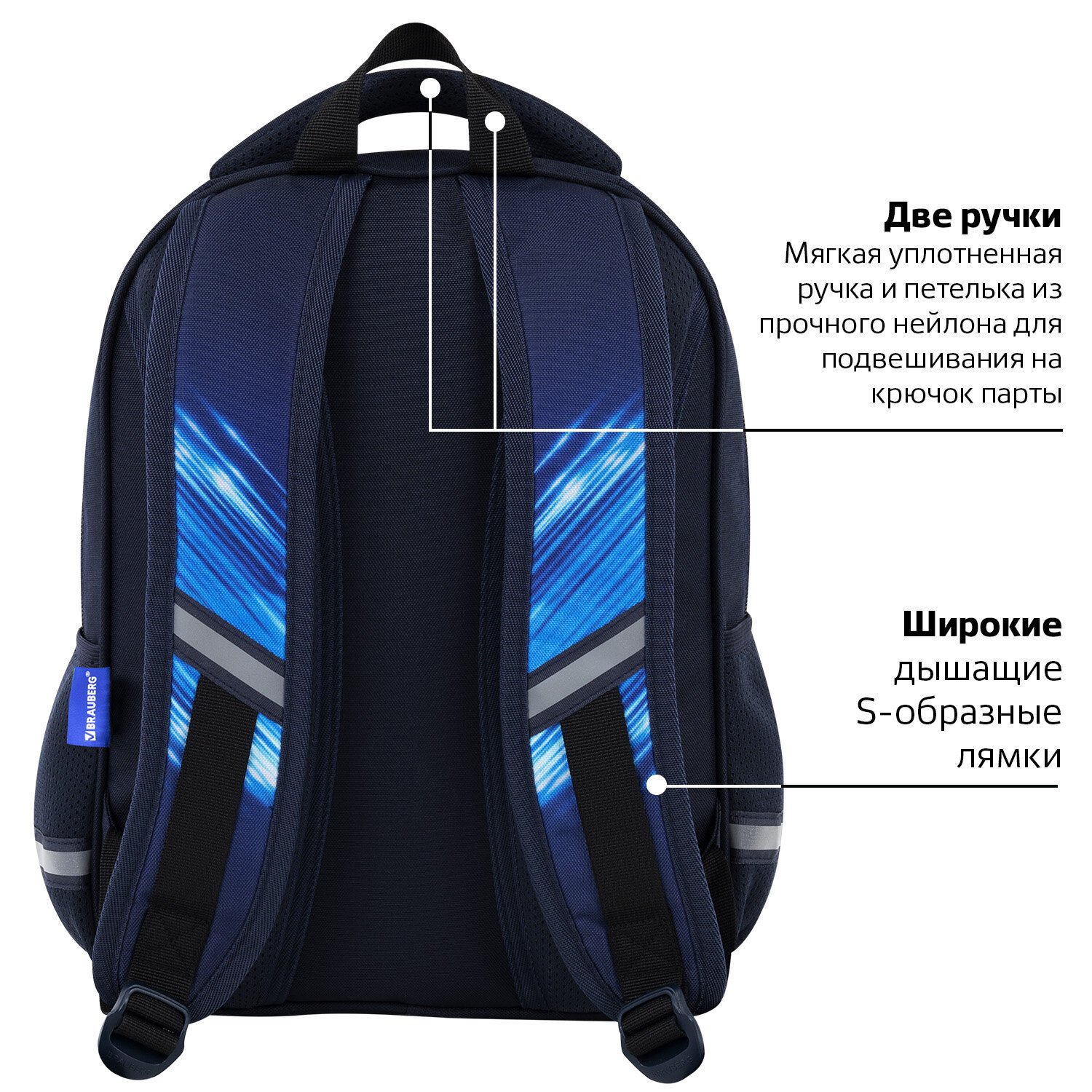 Нести рюкзак будет удобно не только на плечах, но и в руке за прочную уплотненную ручку. Также имеется специальная петелька из плетеной нейлоновой нити, чтобы вешать рюкзак на крючок парты.
