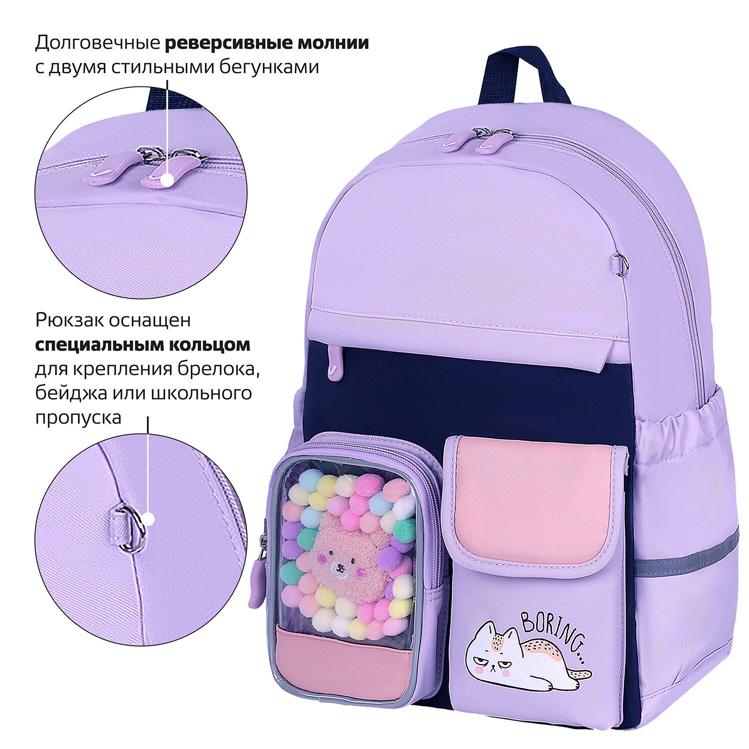 Рюкзак имеет специальное кольцо для крепления брелока, бейджа или школьного пропуска.