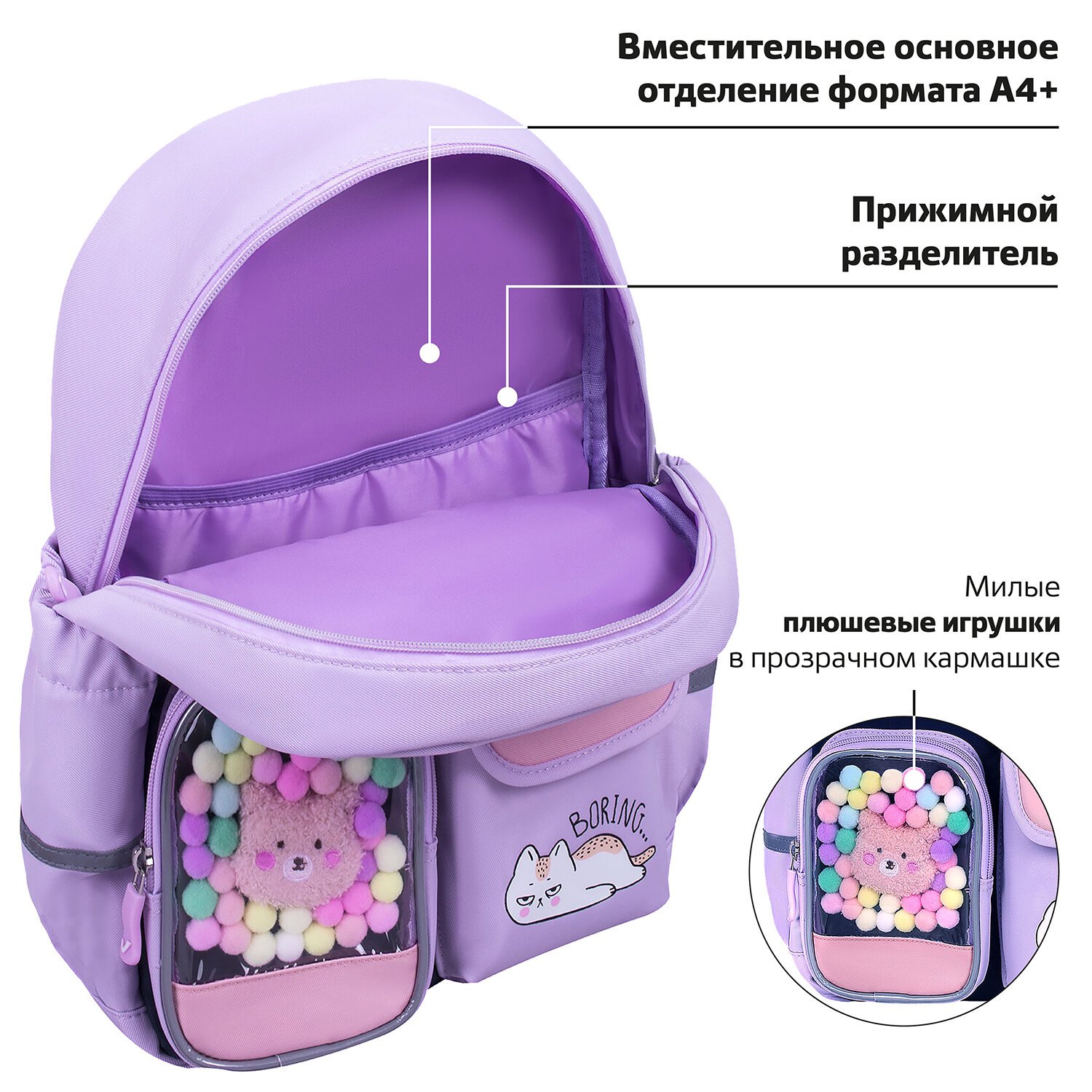 В основном отделении рюкзака можно легко и быстро разместить учебники и тетради формата А4+, а также воспользоваться прижимным разделителем. Спереди рюкзака располагаются три кармана для различных мелочей: прозрачный карман с ярким декоративным наполнением, карман на липучке и большой карман на молнии. Такая структура отделений рюкзака поможет ребенку грамотно разместить в нем школьные принадлежности и личные вещи.