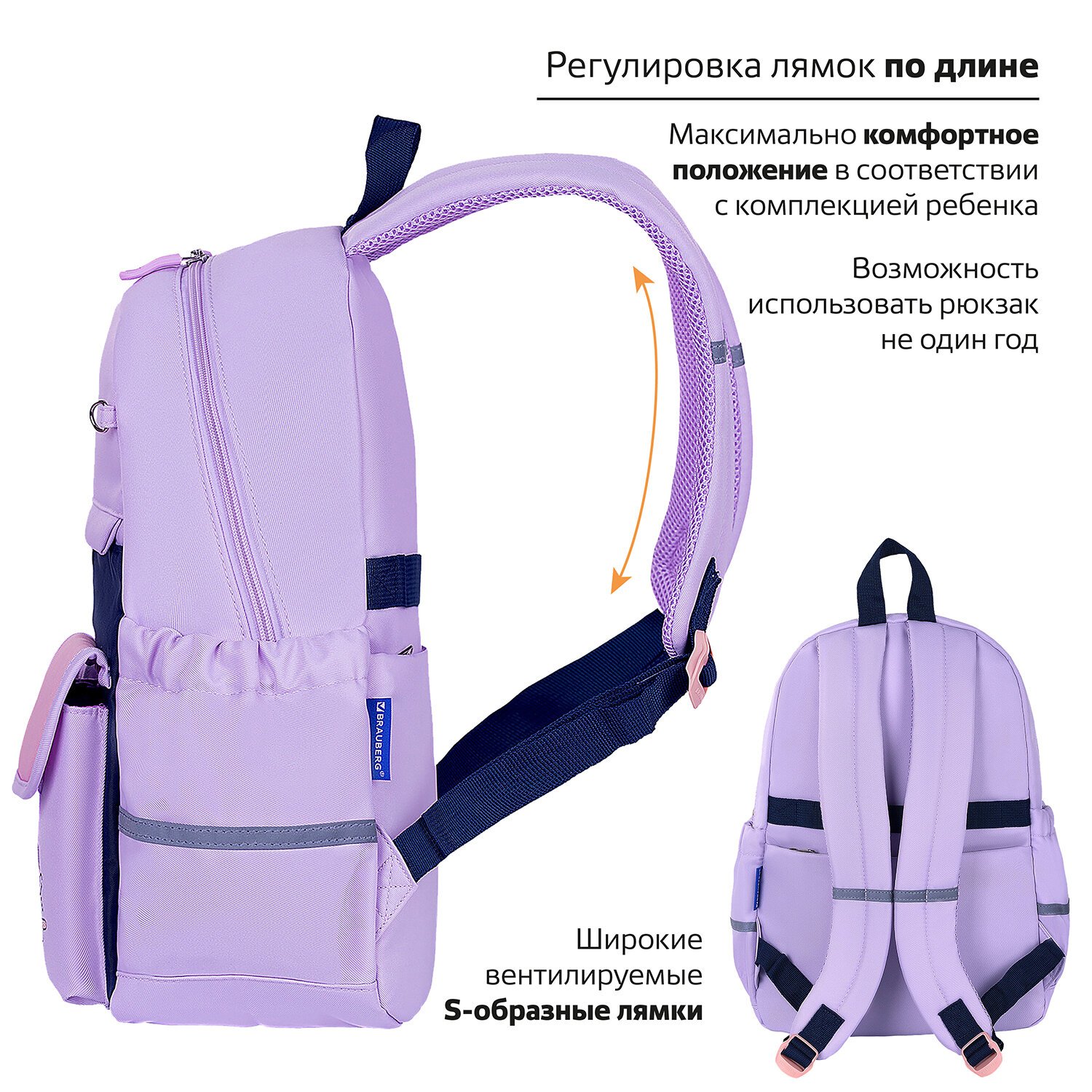 Рюкзак BRAUBERG PASTEL с термонашивками в комплекте, "Lazy cat", сиреневый, 40х29х14 см, 271422