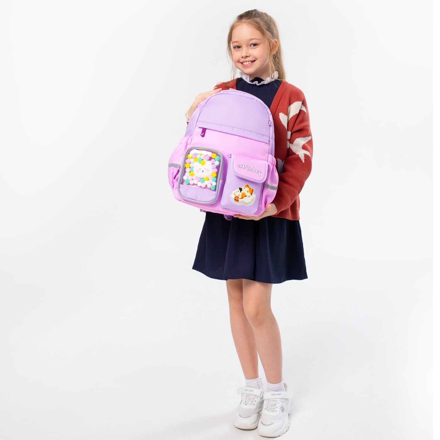 В основном отделении рюкзака легко и удобно размещаются учебники и тетради формата А4+, а также предусмотрен прижимной разделитель. На передней части рюкзака расположены три кармана для различных мелочей: прозрачный карман с ярким декоративным наполнением, карман на липучке и большой карман на молнии. Такая организация отделений поможет ребенку грамотно распределить школьные принадлежности и личные вещи.
