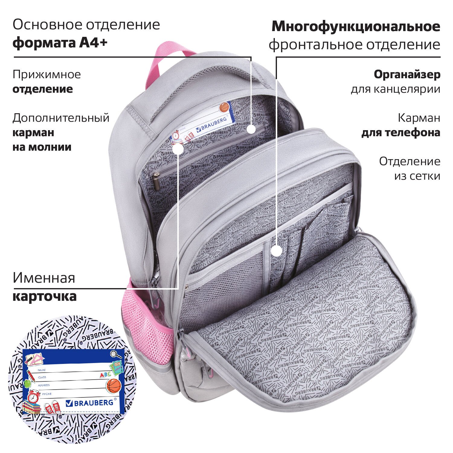 В основном отделении рюкзака можно легко и быстро разместить учебники и тетради формата А4+, а также воспользоваться прижимным отделением и дополнительным карманом на молнии. Также в основном отделении находится именная карточка школьника. Внутри фронтального отделения находится органайзер для канцтоваров, карман для телефона и большое отделение из сетки. Большой передний карман на молнии вмещает тетради и учебники формата А5. Такая организация пространства поможет держать принадлежности в сохранности и приучить ребенка к порядку.