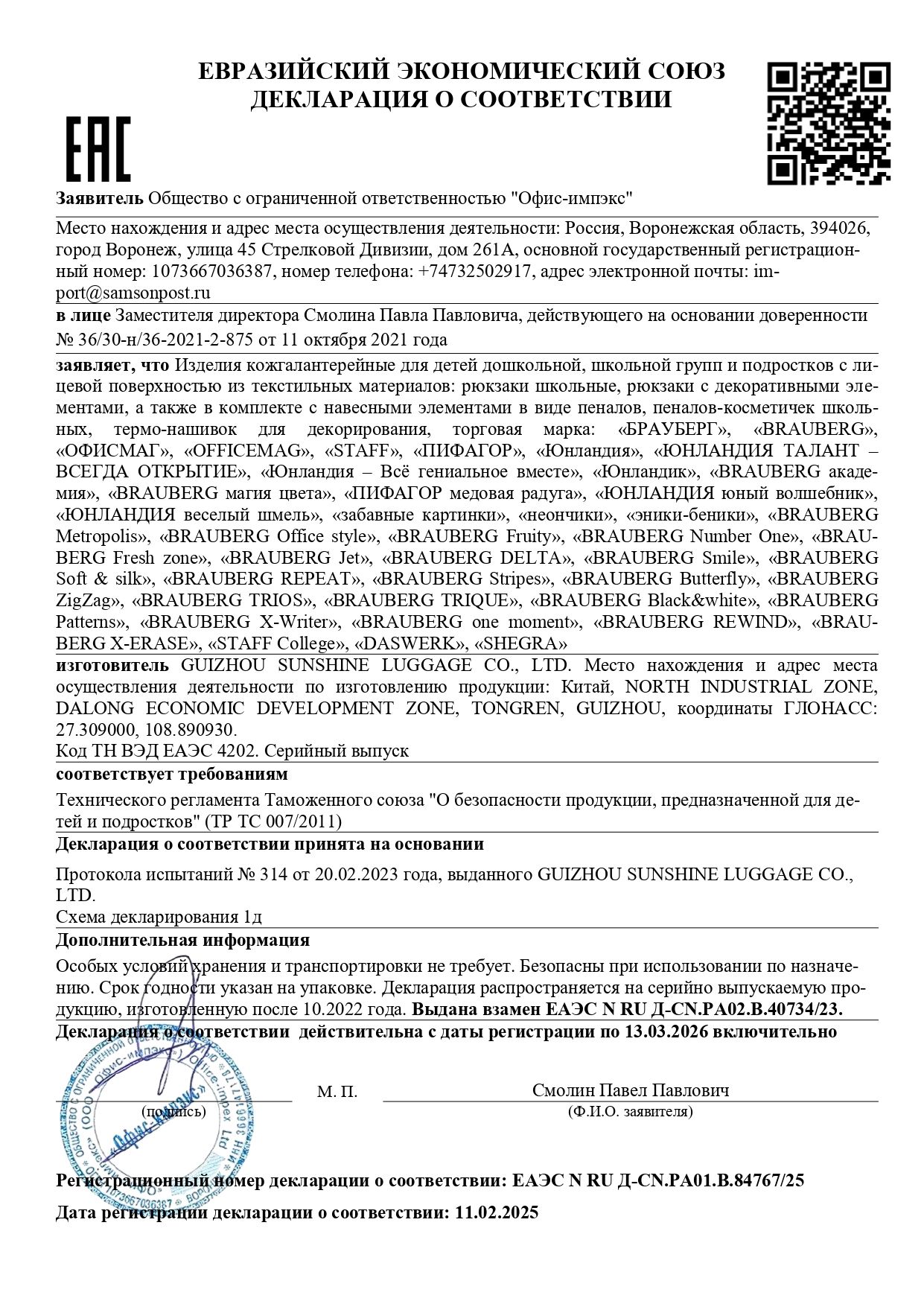 Яркая этикетка, расположенная на передней стороне рюкзака, делает его более заметным на полке магазина, а информация на ней отражает основные потребительские свойства товара, помогая покупателю сделать выбор.