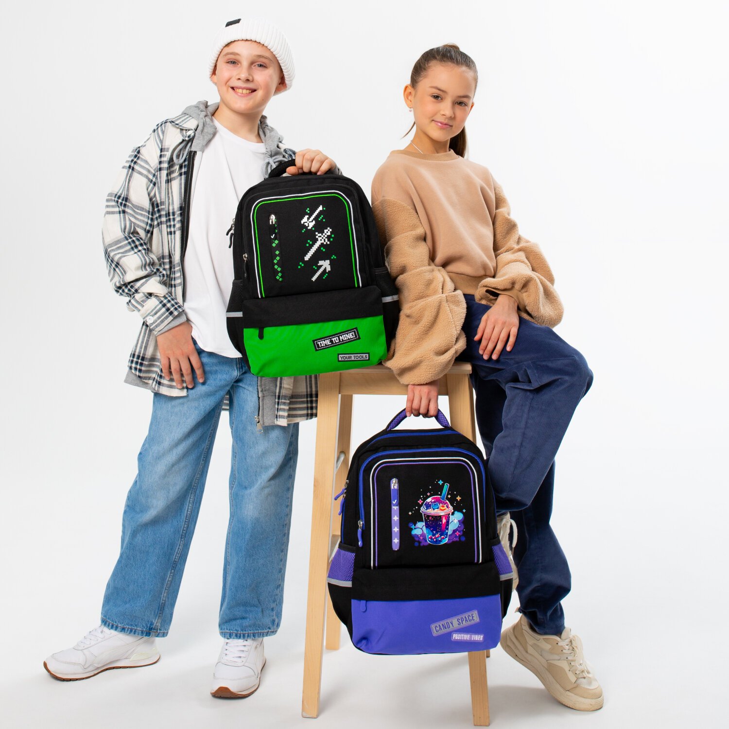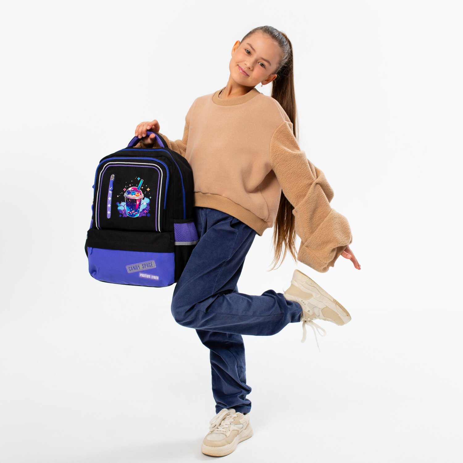 В основном отделении рюкзака легко и быстро размещаются учебники и тетради формата А4+, а также предусмотрены прижимные разделители. На передней части рюкзака расположены два больших кармана на молнии для тетрадей формата А5 и канцелярских принадлежностей, а также небольшой карман для мелочей или телефона. Такая организация пространства помогает сохранить школьные принадлежности в порядке и приучает ребенка к аккуратности.
