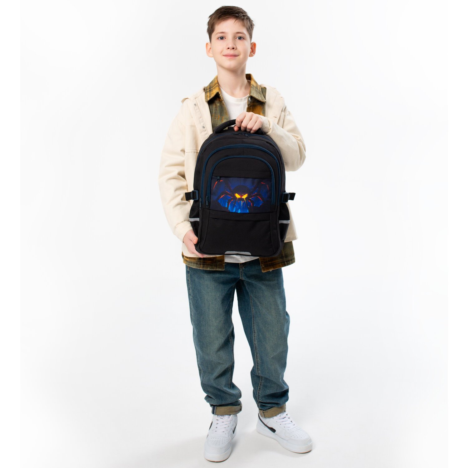В основном отделении рюкзака легко и быстро размещаются учебники и тетради формата А4+. Вместительное переднее отделение подходит для тетрадей и учебников формата А4, а три дополнительных кармана на молнии удобны для хранения мелочей. Такая организация пространства помогает сохранить принадлежности в порядке и приучает ребенка к аккуратности.