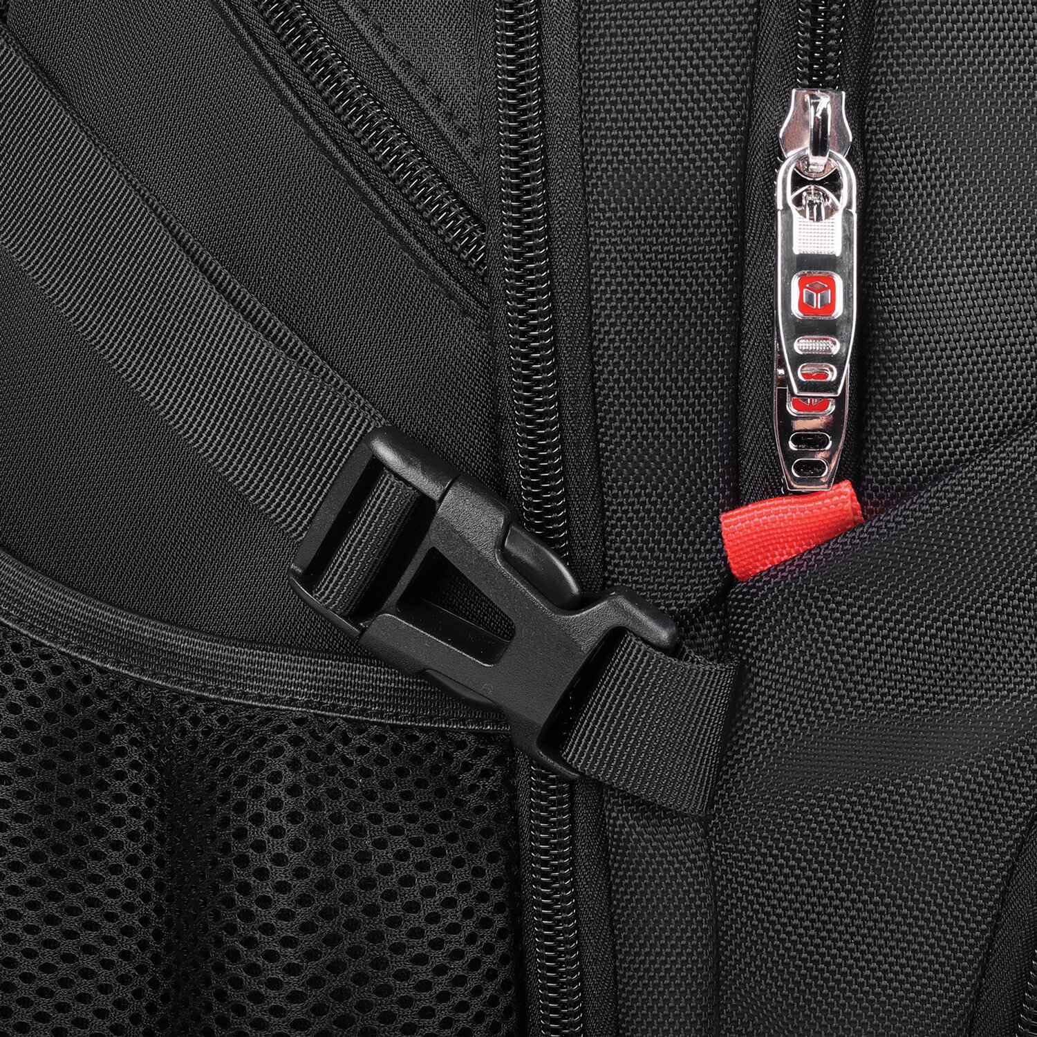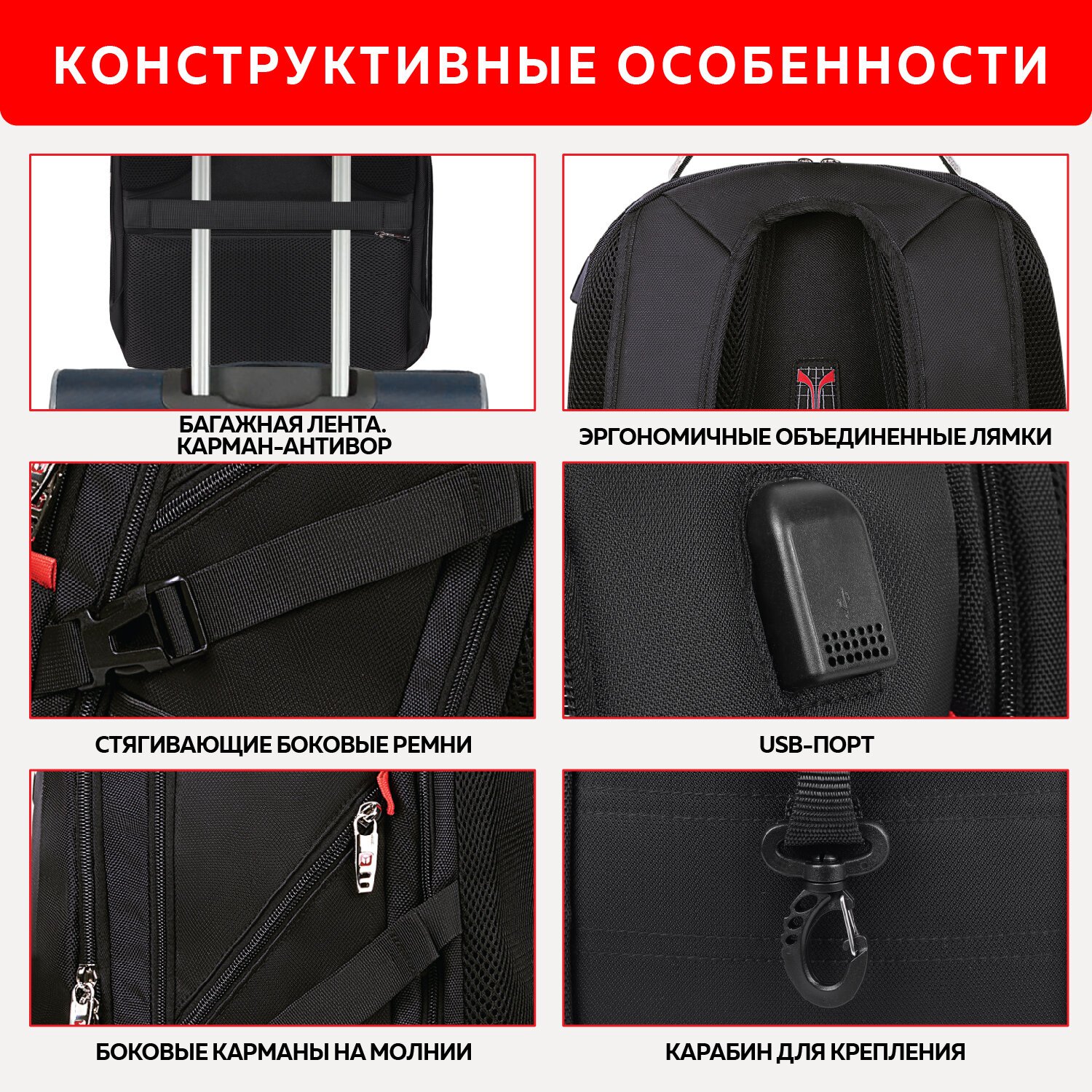 На боковых сторонах размещены карманы на молнии и карманы из сетки.