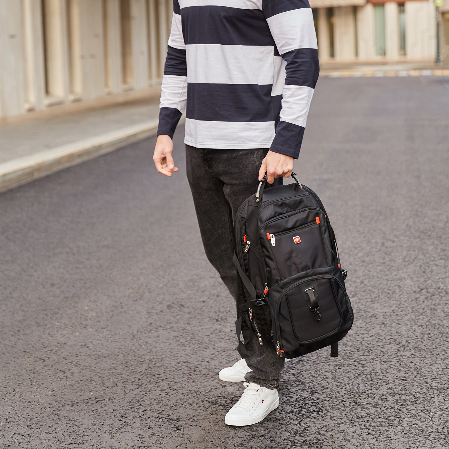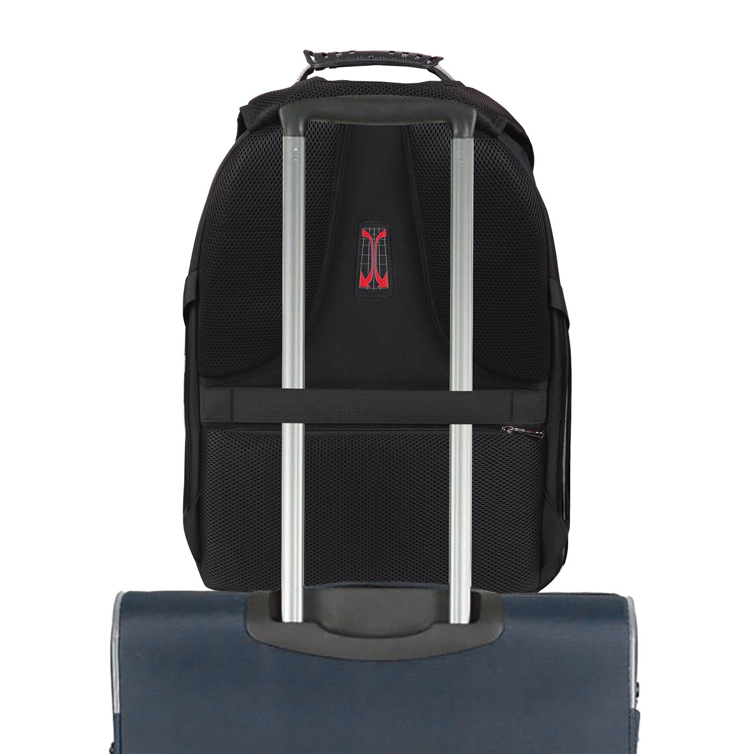 Багажная лента позволяет зафиксировать рюкзак на телескопической ручке чемодана для удобного перемещения нескольких предметов багажа.