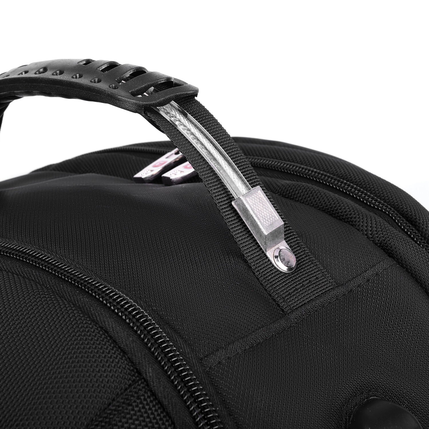 Прочная ручка с металлическим тросом и удобной резиновой вставкой надежно крепится к рюкзаку.