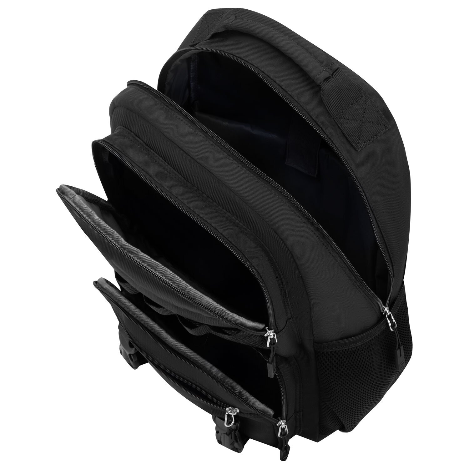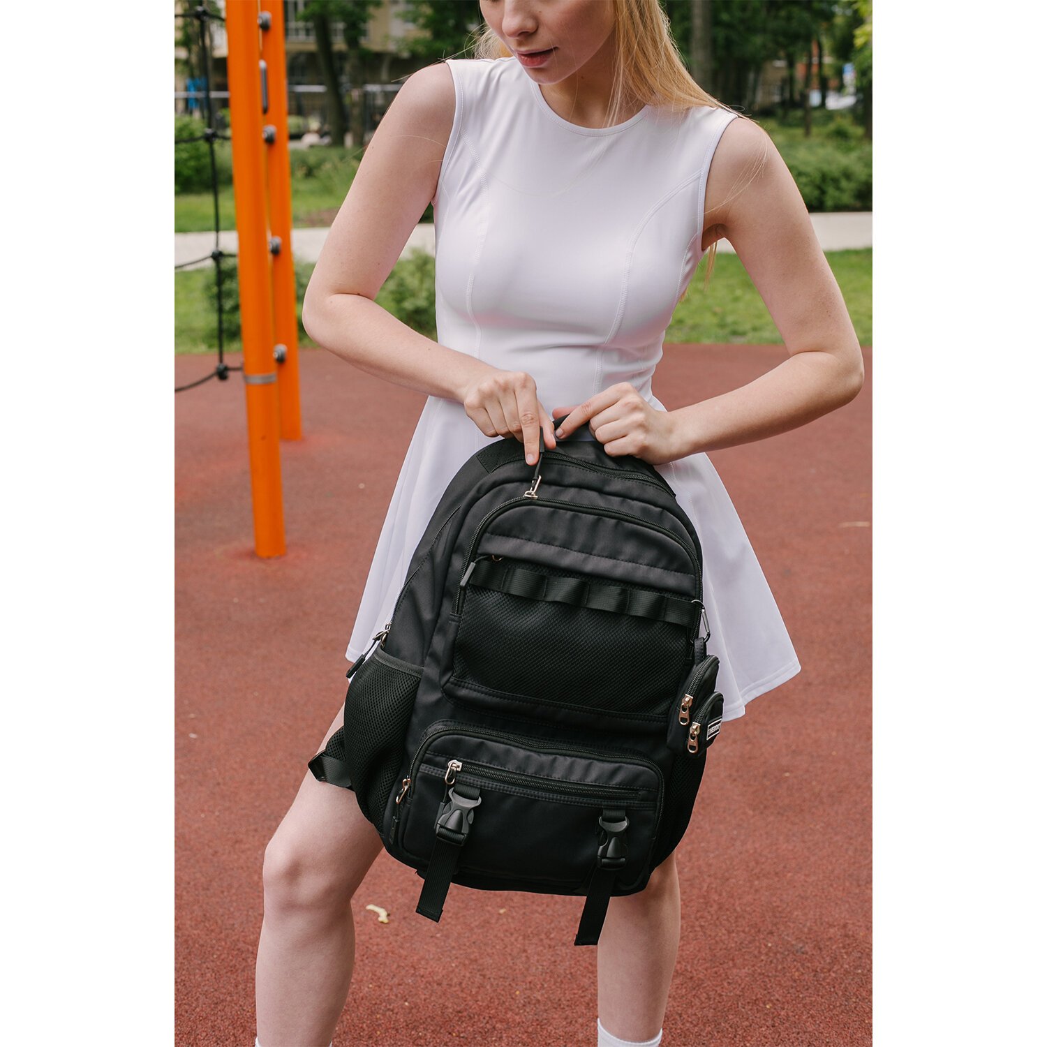 Рюкзак отличается множеством внешних карманов: 4 передних кармана на молнии различного размера, а также плотные боковые карманы из эластичной сетки, в которых легко разместить бутылочку, термос или зонт.