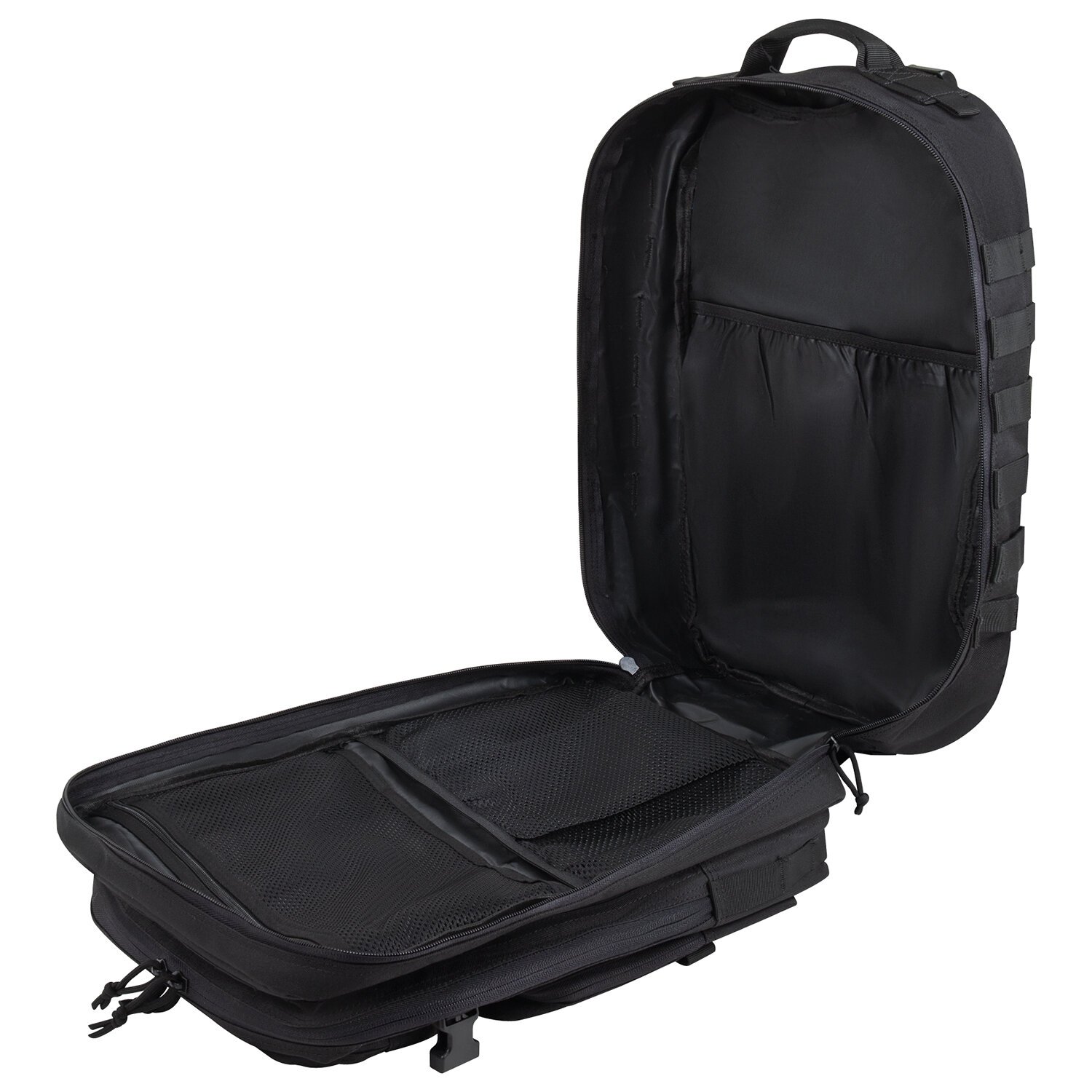 Фронтальная часть имеет два кармана на молнии, оснащенные системой "Молле". На верхнем кармане расположены съемные декоративные элементы. Специальный карман во основном отделении можно использовать для журналов или тетрадей. Отделение также имеет 2 кармана из сетки, один из которых на молнии. В дополнительном отделении расположен органайзер, в котором можно разместить небольшие предметы, такие как наушники, ключи.