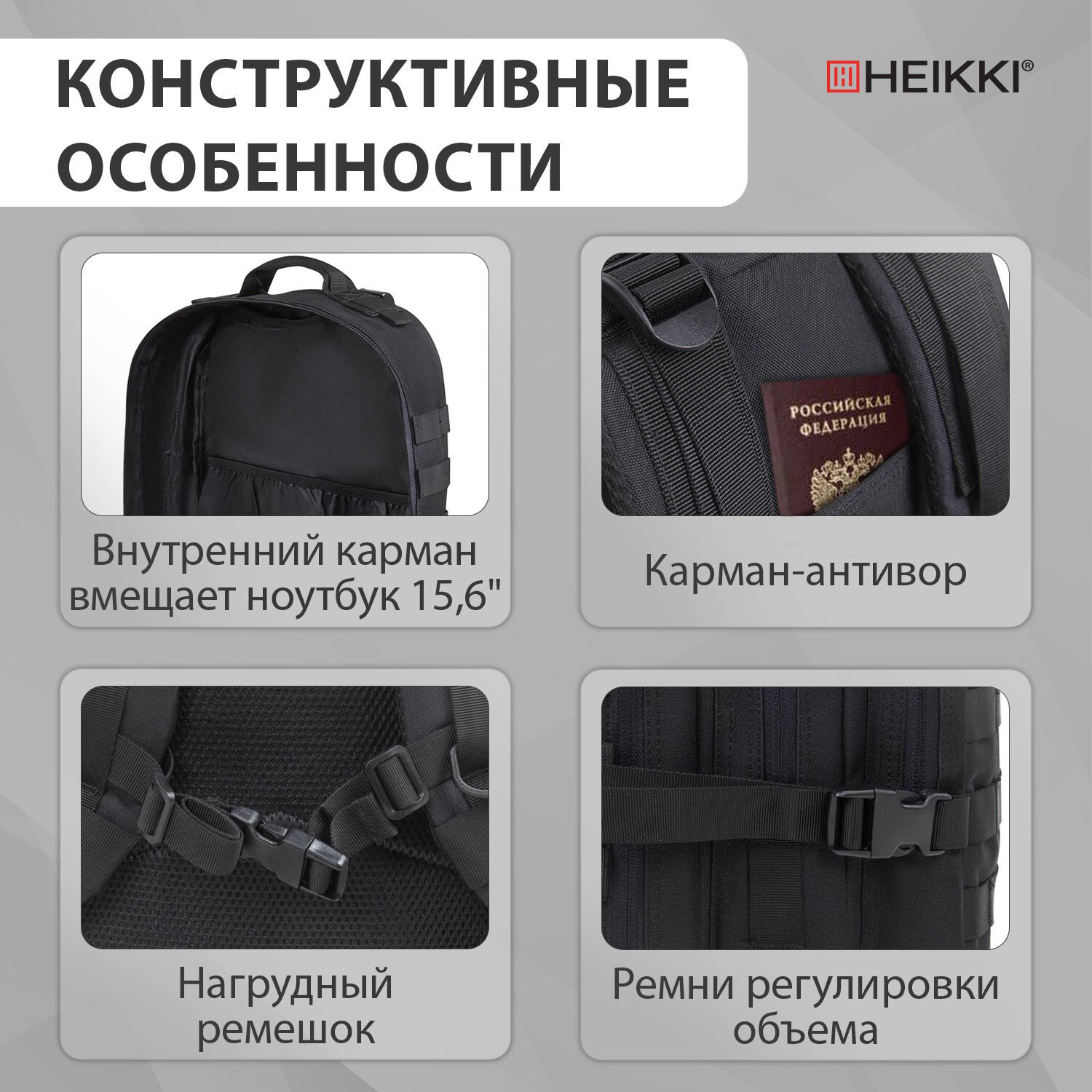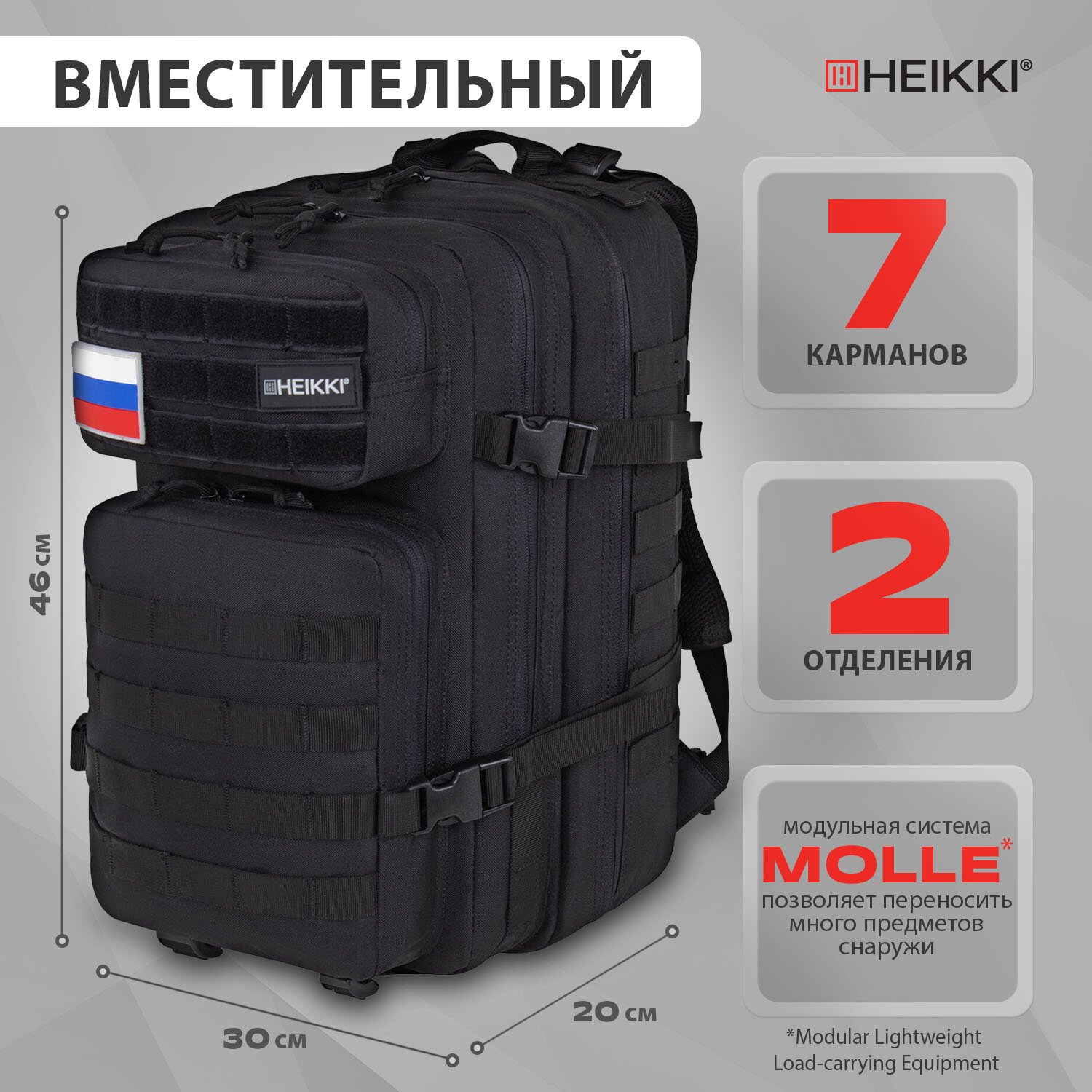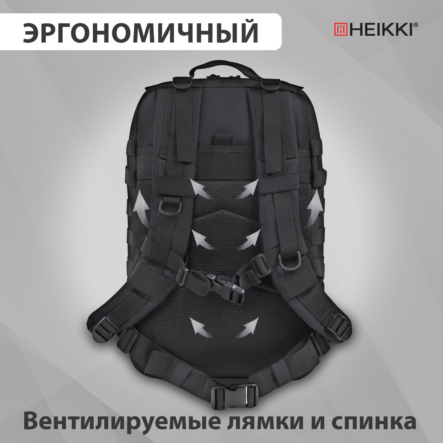 Рюкзак HEIKKI STRATEGY (ХЕЙКИ) тактический, 2 отделения, система Молле, черный, 46х30х20 см, 272584