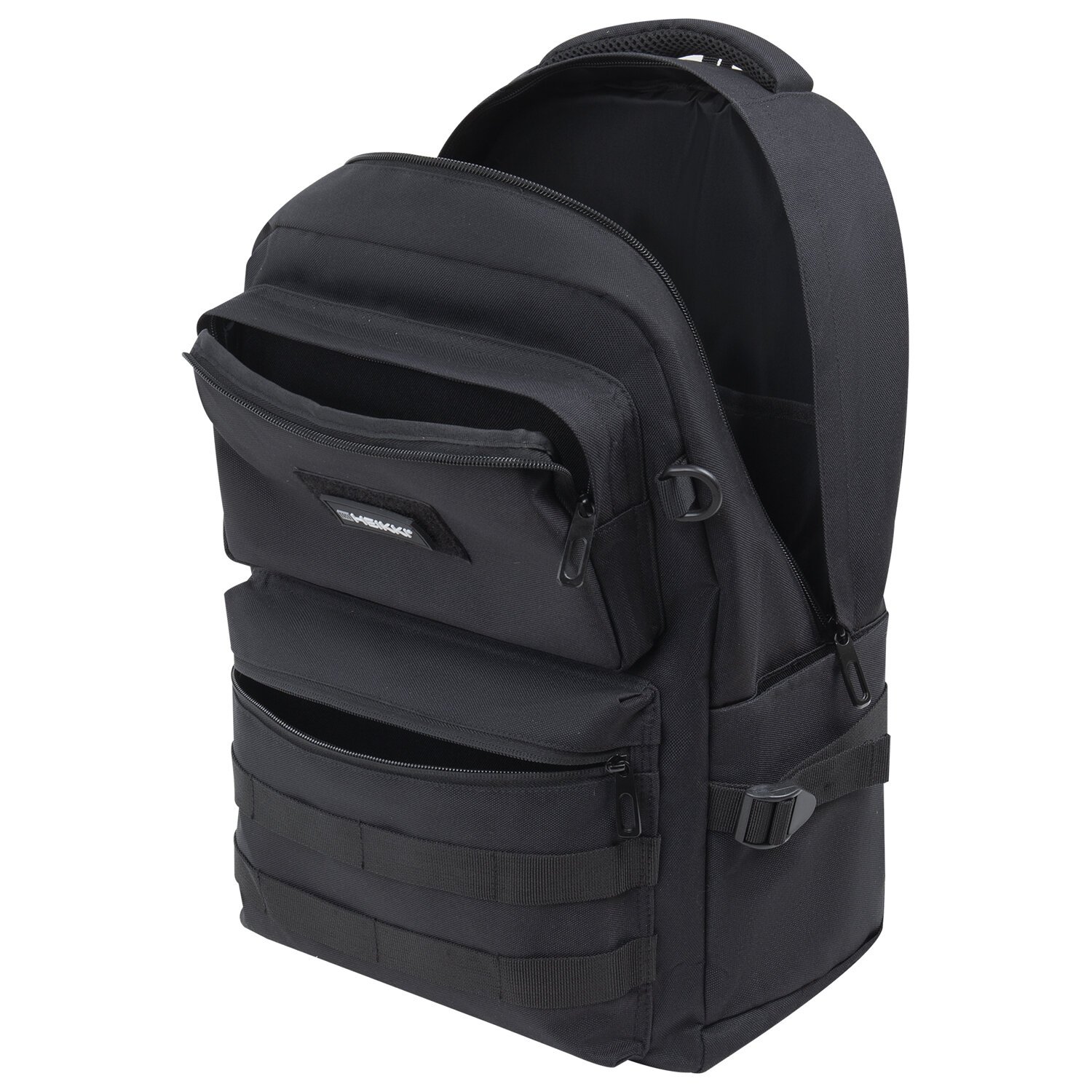 Фронтальная часть имеет два кармана на молнии, нижний из которых оснащен системой Молле.