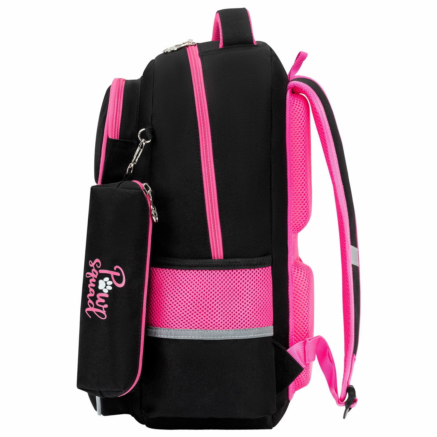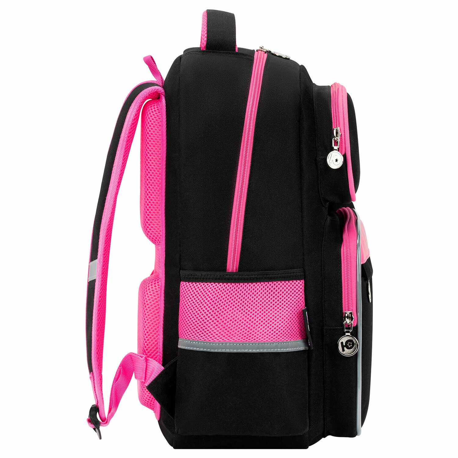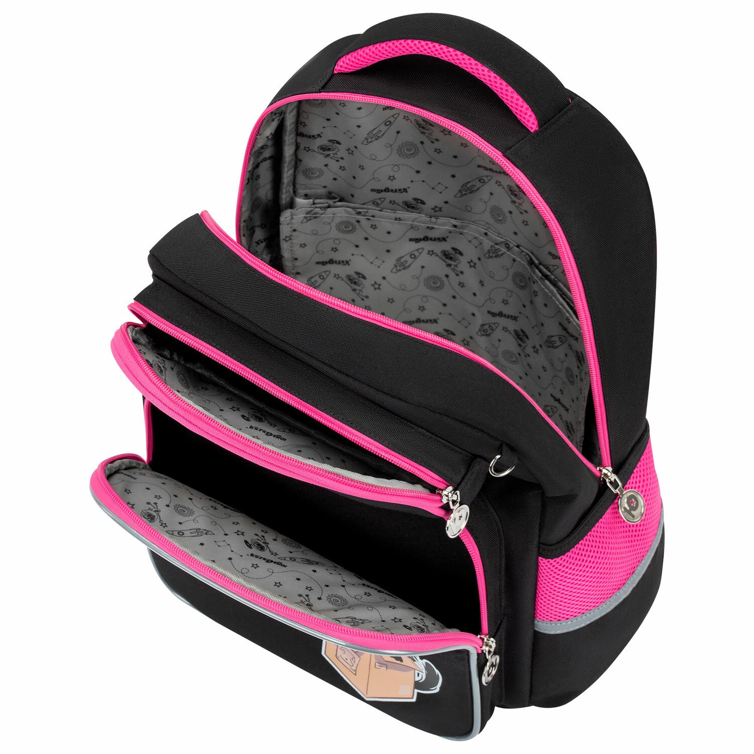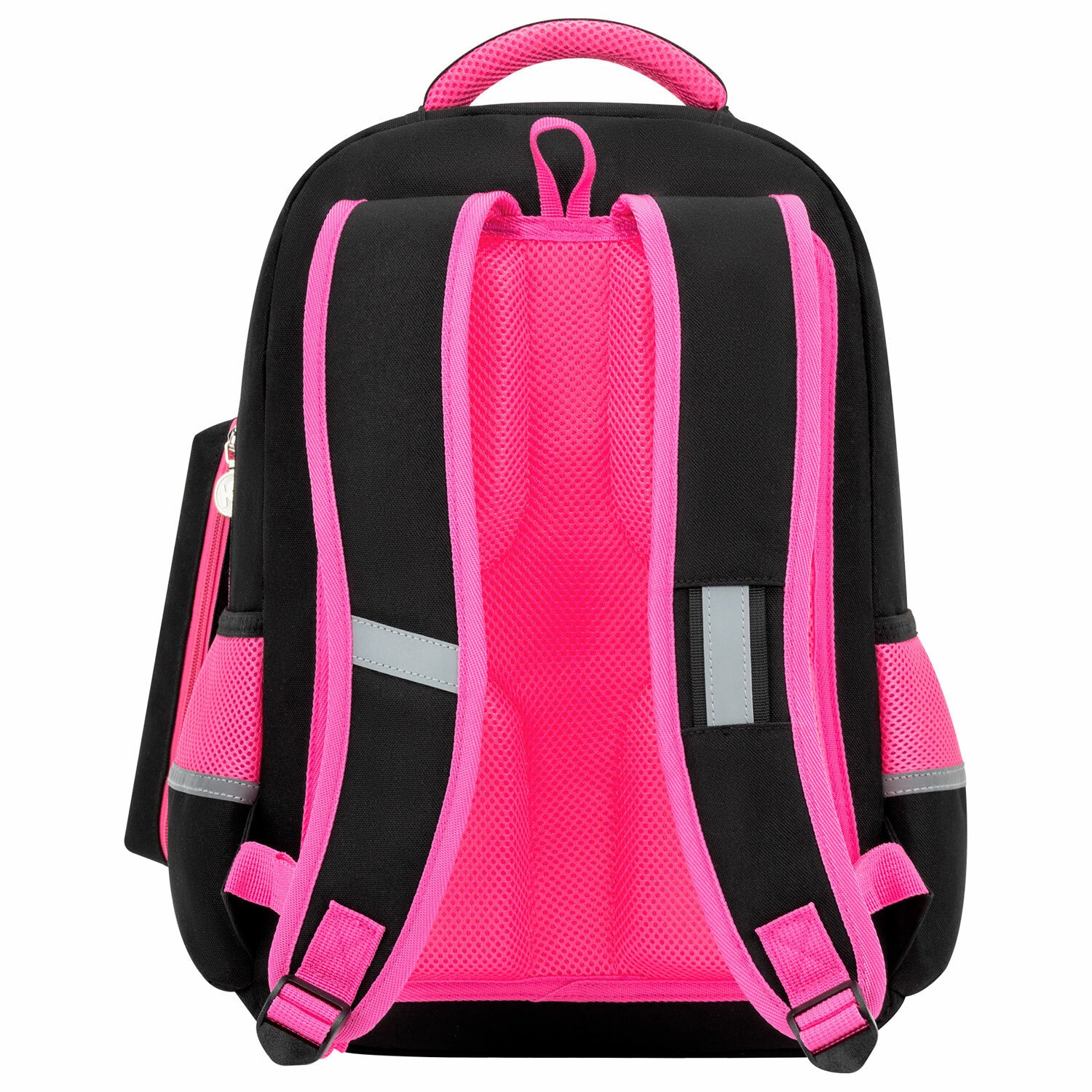 Рюкзак снабжен усиленной ручкой из ткани и петелькой для подвешивания на крючок, а также фиксатором для тетрадей. Светоотражающие элементы с четырех сторон обеспечивают безопасность в темное время суток.