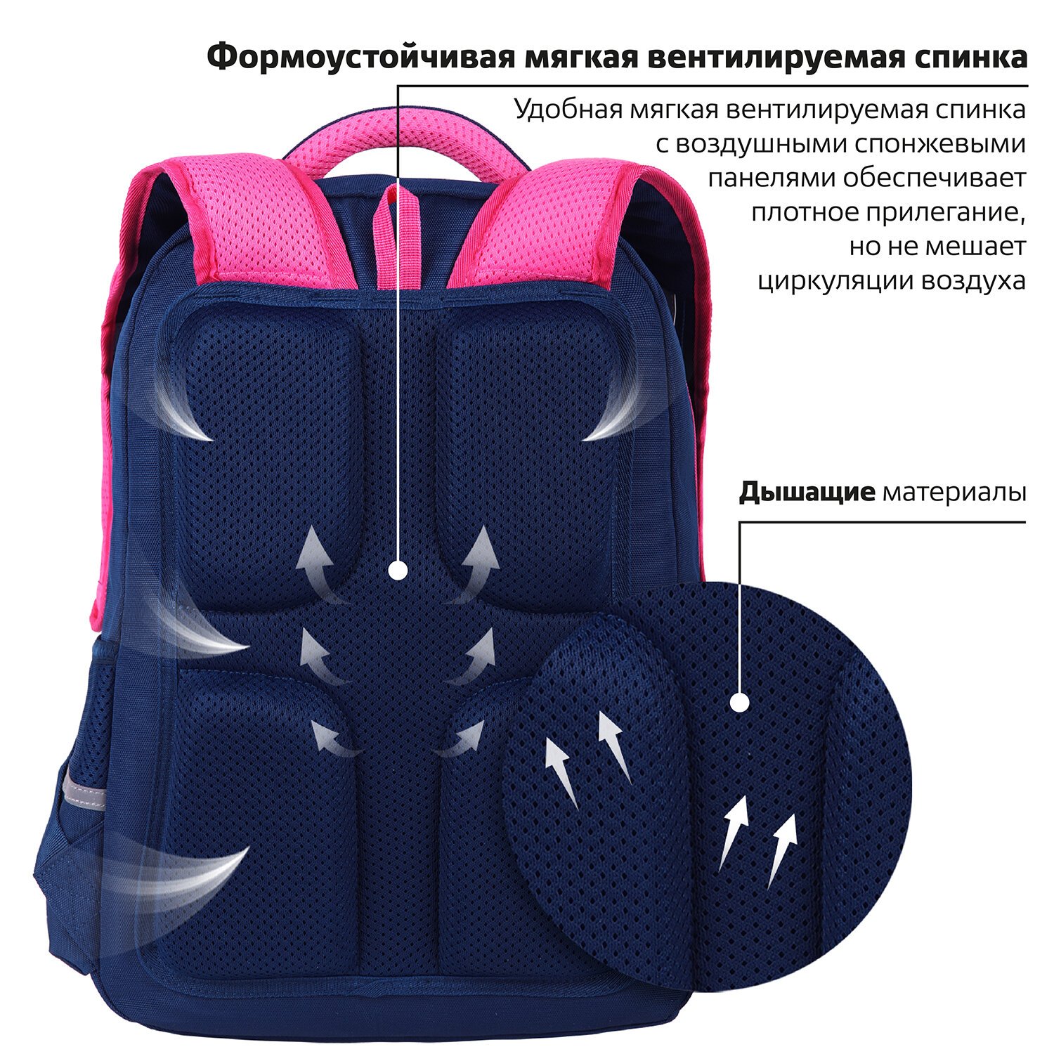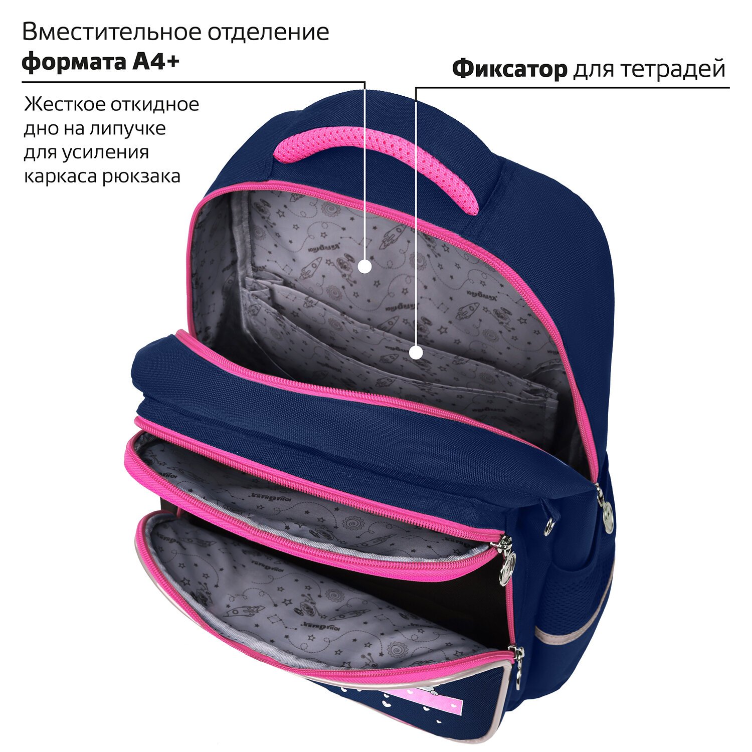 Рюкзак снабжен усиленной ручкой из ткани и петелькой для подвешивания на крючок, а также фиксатором для тетрадей. Светоотражающие элементы с четырех сторон обеспечивают безопасность в темное время суток.