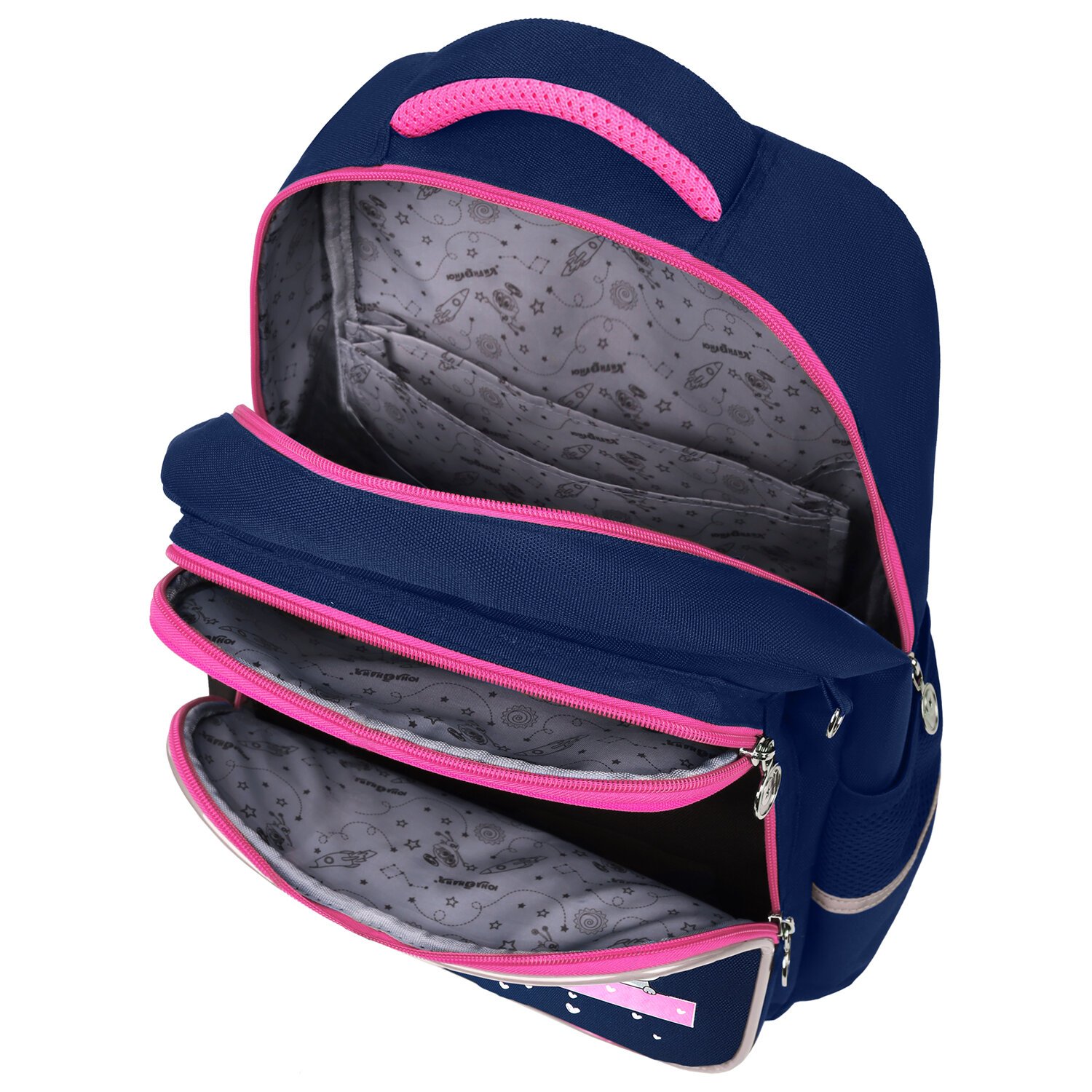 Рюкзак с формоустойчивой вентилируемой спинкой имеет 1 вместительное отделение на молнии и 5 карманов. Оптимальный размер рюкзака позволяет вместить все необходимые школьные принадлежности. Мягкие широкие регулируемые лямки способствуют оптимальному распределению веса.