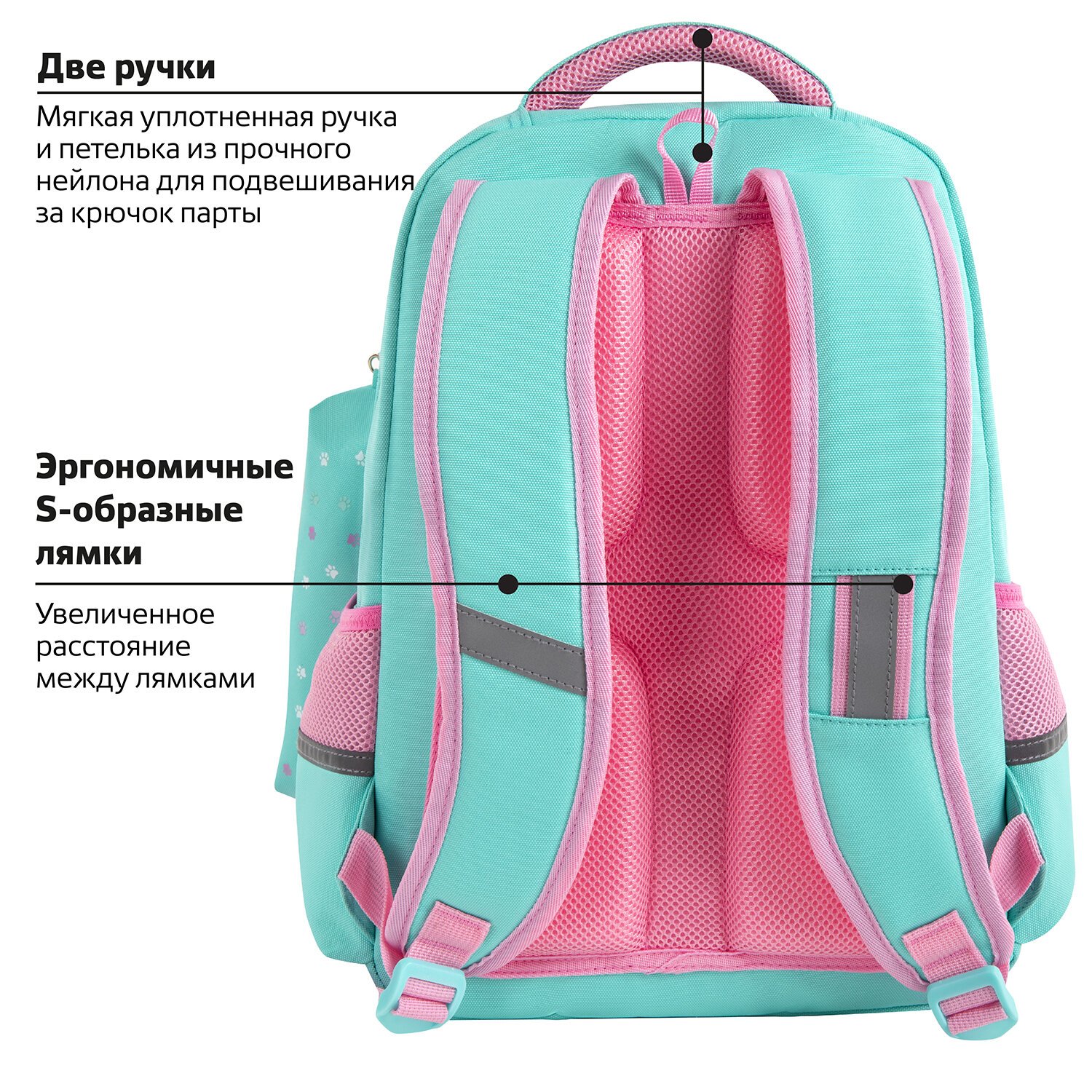 Рюкзак снабжен усиленной ручкой из ткани и петелькой для подвешивания на крючок, а также фиксатором для тетрадей. Светоотражающие элементы с четырех сторон обеспечивают безопасность в темное время суток.