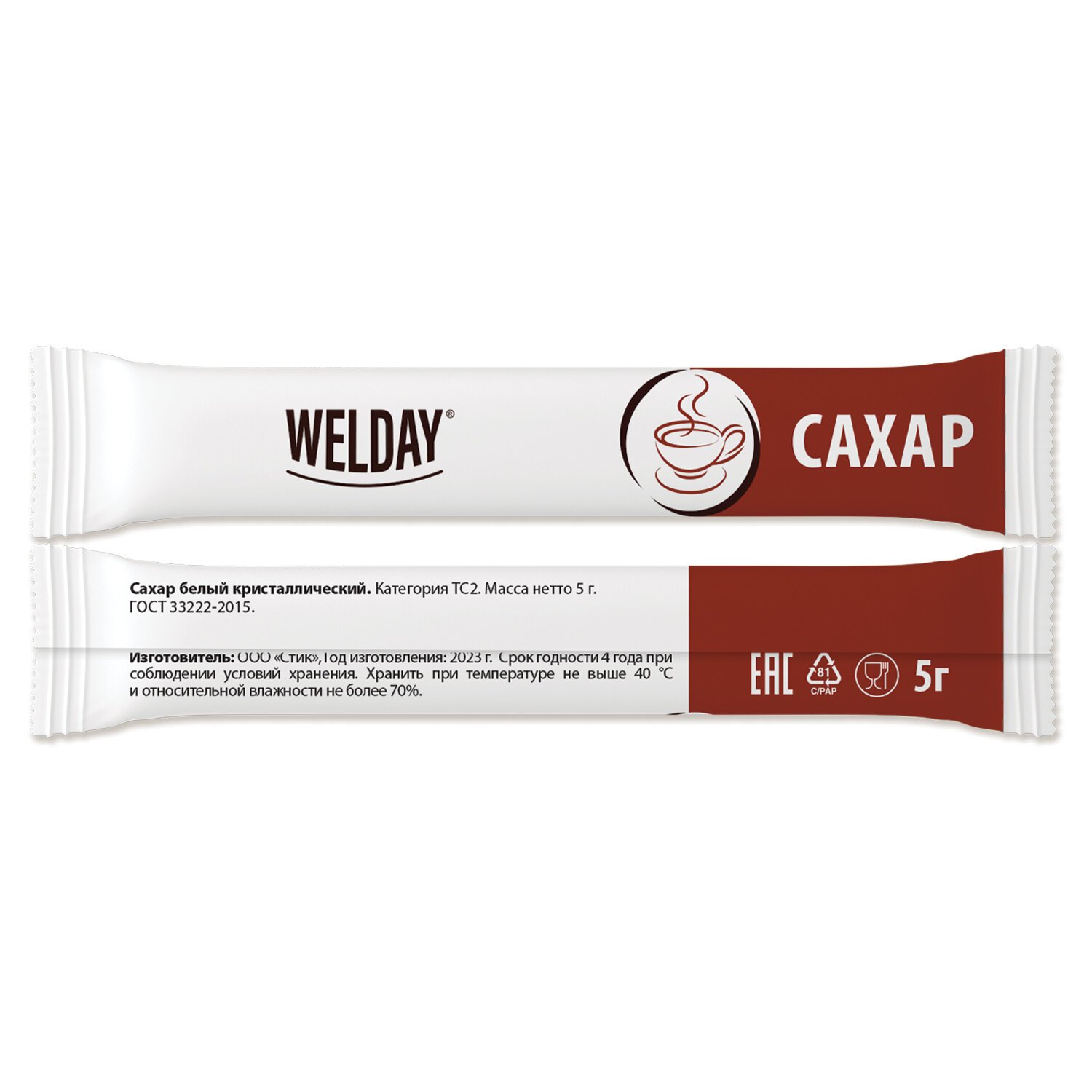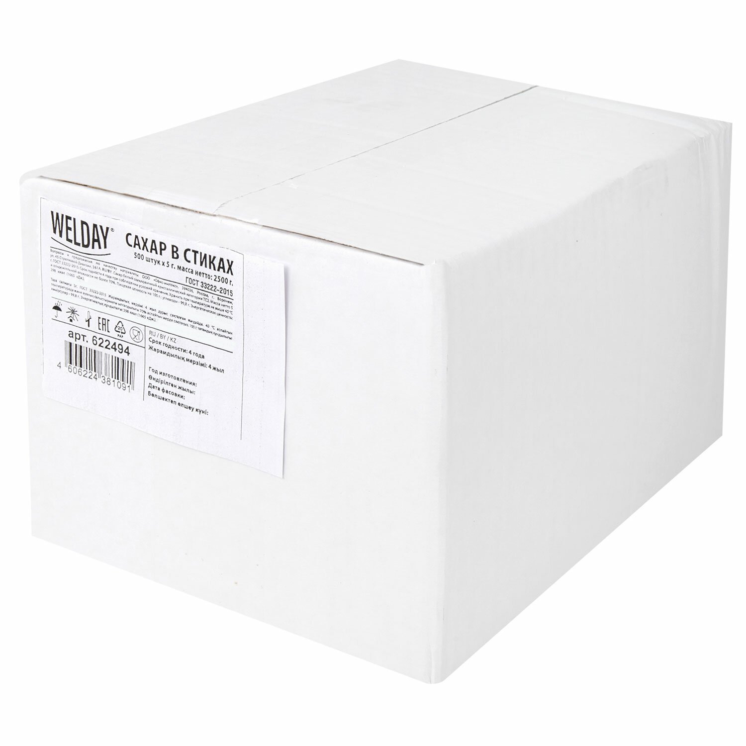 Сахар в стиках WELDAY. Порционная упаковка в трехшовные пакетики-стики по 5 грамм обеспечивает удобство применения. В одной упаковке 500 стиков общим весом 2,5 кг.