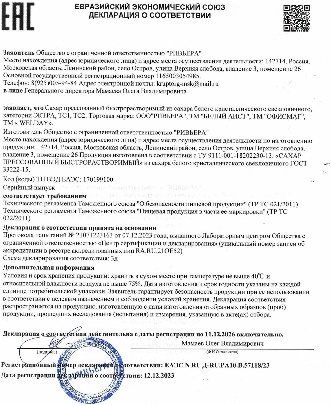 Сахар-рафинад WELDAY прессованный быстрорастворимый производится на современном оборудовании из сахара-песка высокого качества. Вес пачки - 1 кг (336 кусочков).
