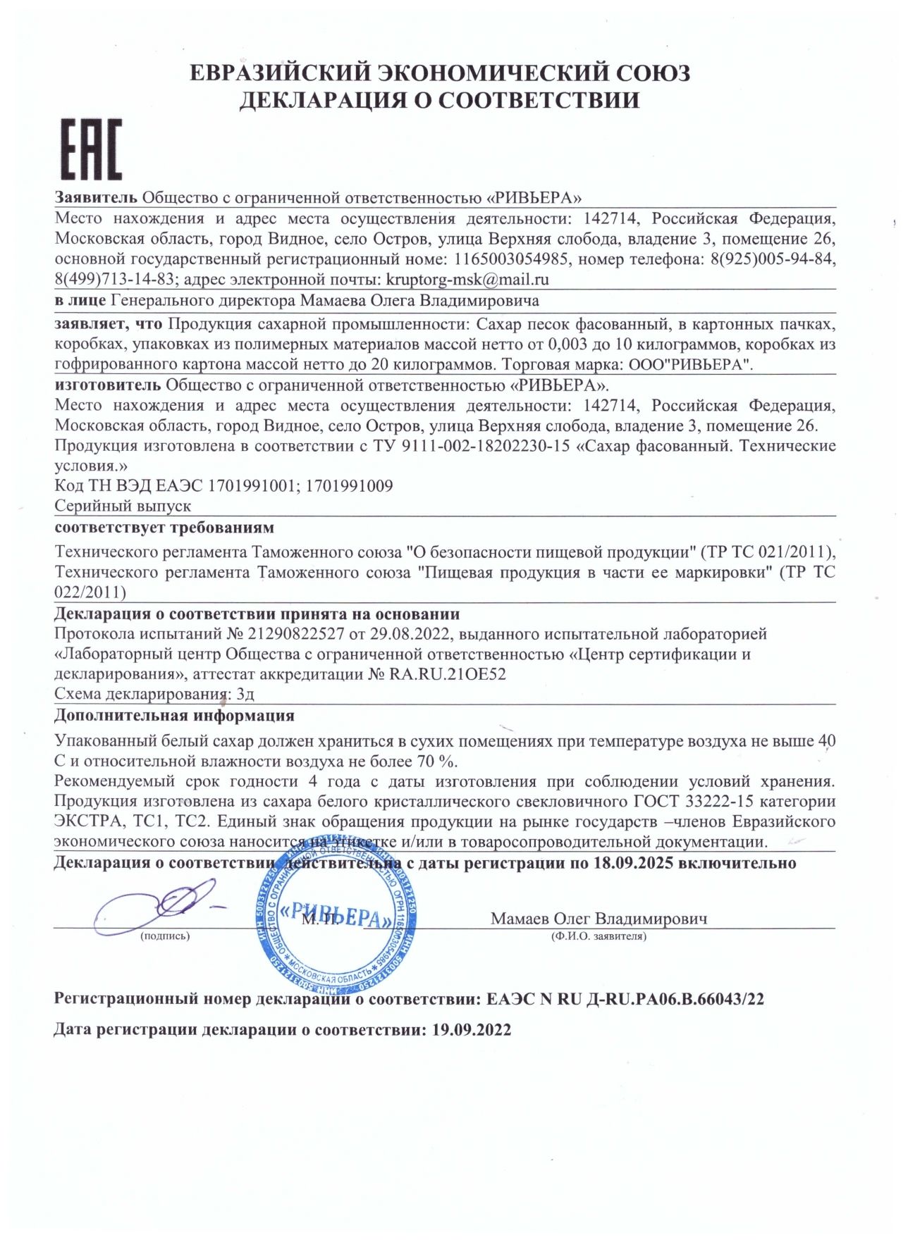 Сахар белый свекловичный кристаллический категории ТС 2, в соответствии с ГОСТ 33222-2015.