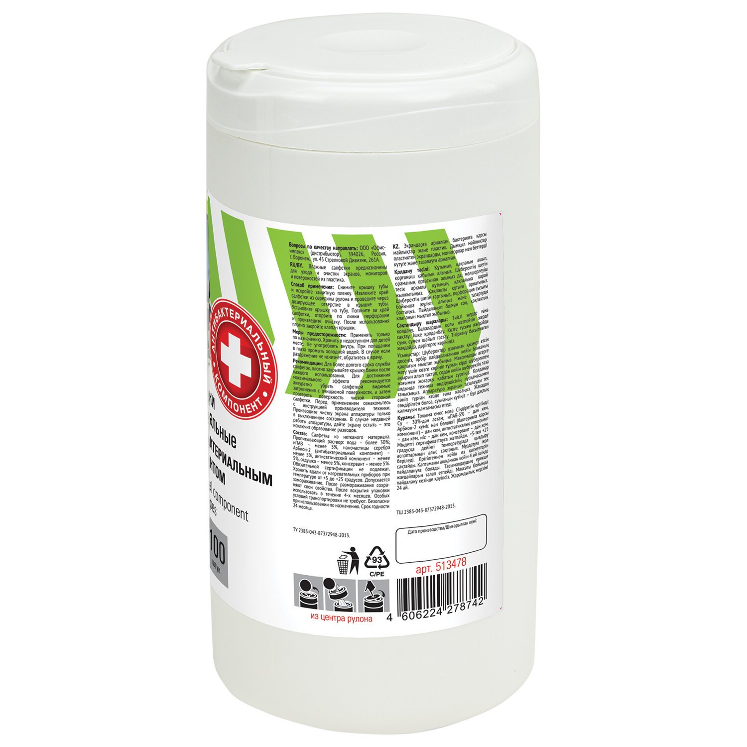 Салфетки АНТИБАКТЕРИАЛЬНЫЕ ДЛЯ БЫТОВОЙ И ОРГТЕХНИКИ, ПЛОТНЫЕ, BRAUBERG, 100 шт., 513477