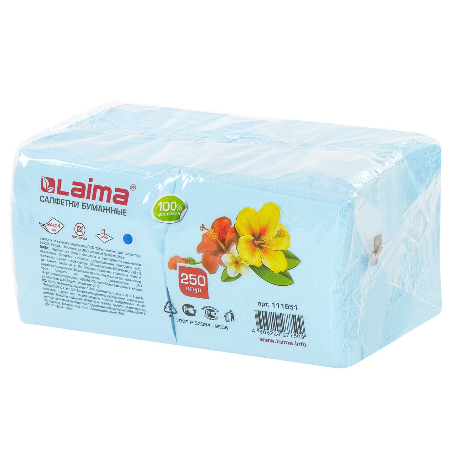 Салфетки бумажные 250 штук, 24х24 см, LAIMA, синие (пастельный цвет), 100% целлюлоза, 111951