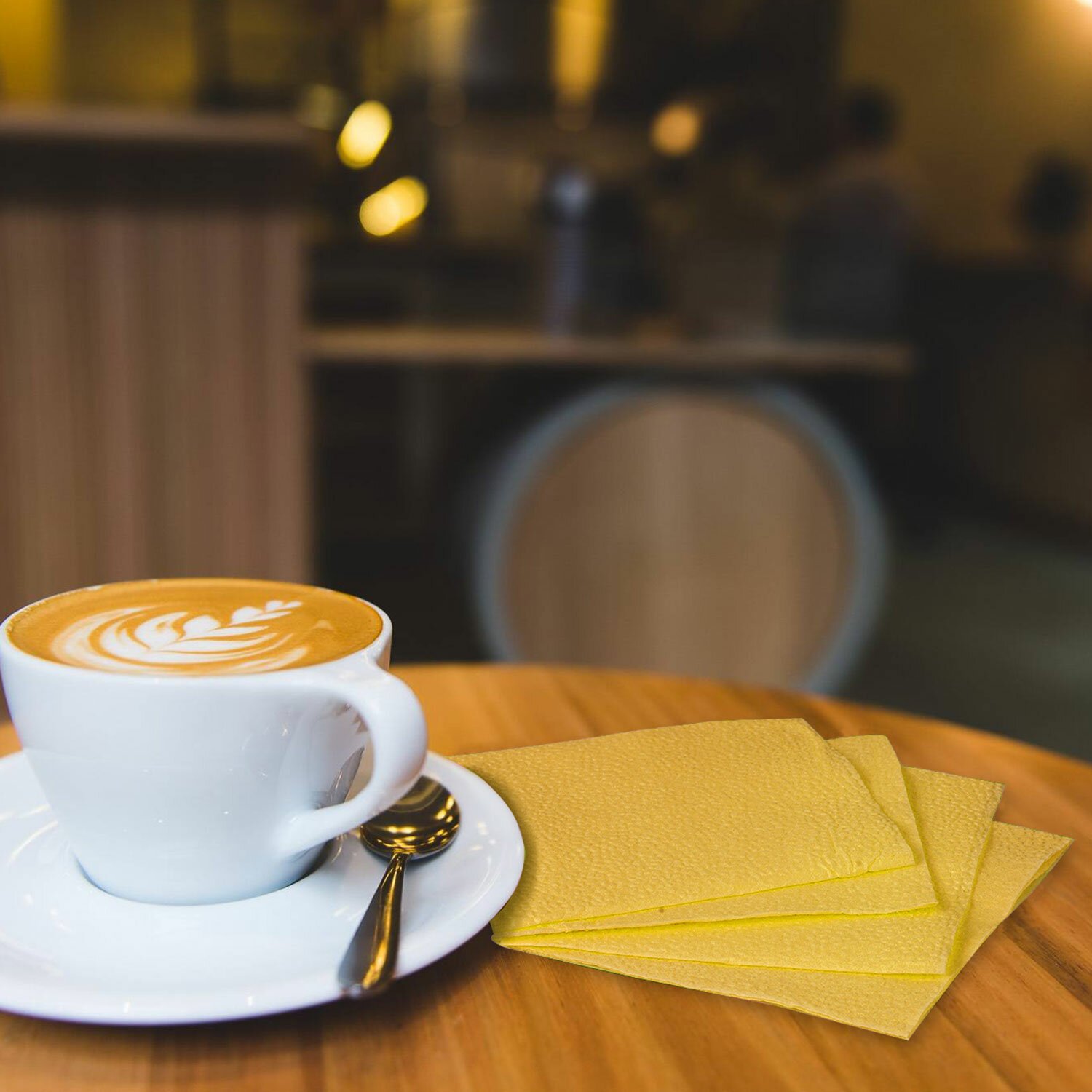 Упаковка содержит 400 салфеток размером 24х24 см. Однослойные салфетки 1/4 сложения выполнены в желтом цвете. Тиснение придает изделию привлекательный внешний вид. Изготовлены из 100% целлюлозы, что обеспечивает прочность и повышенную впитываемость.