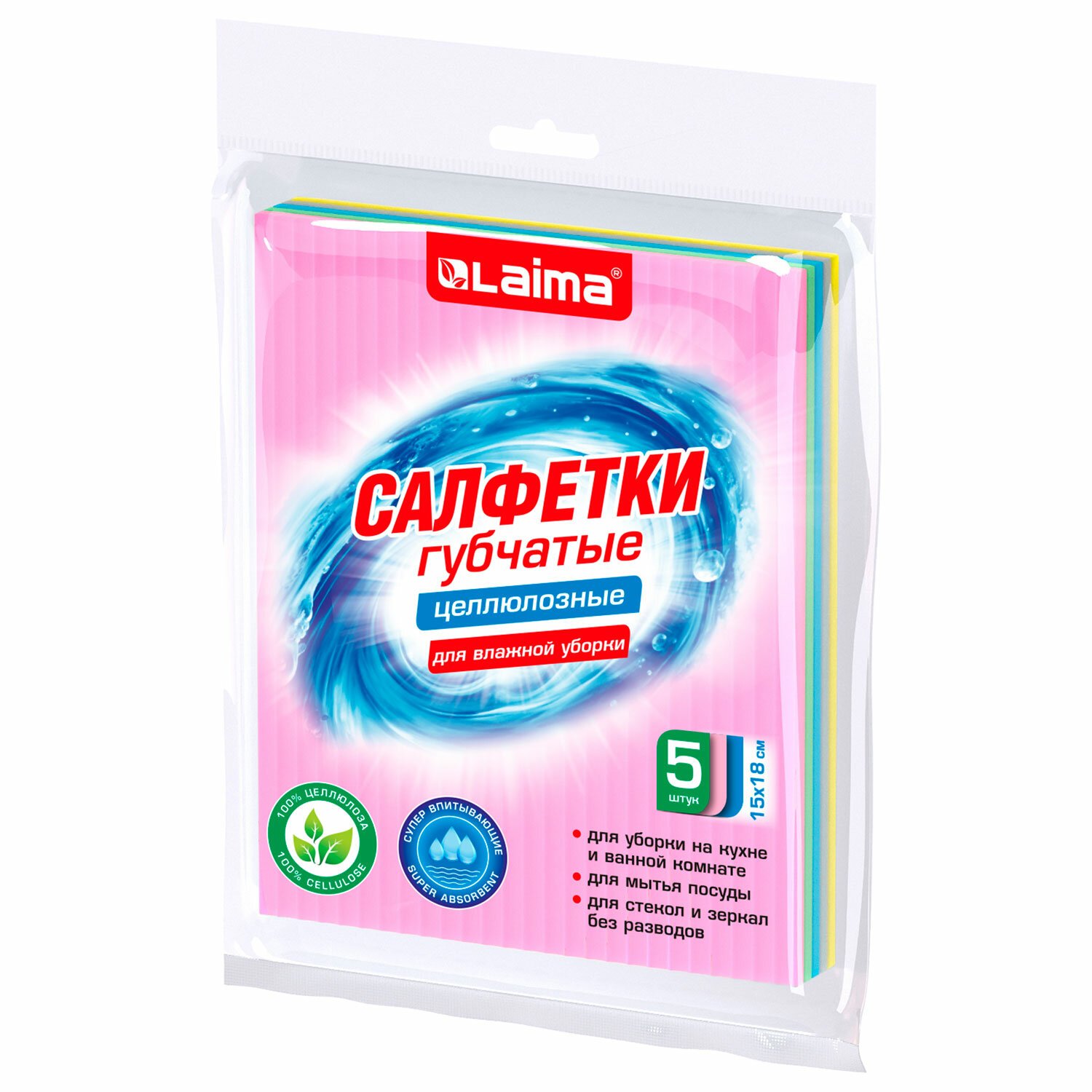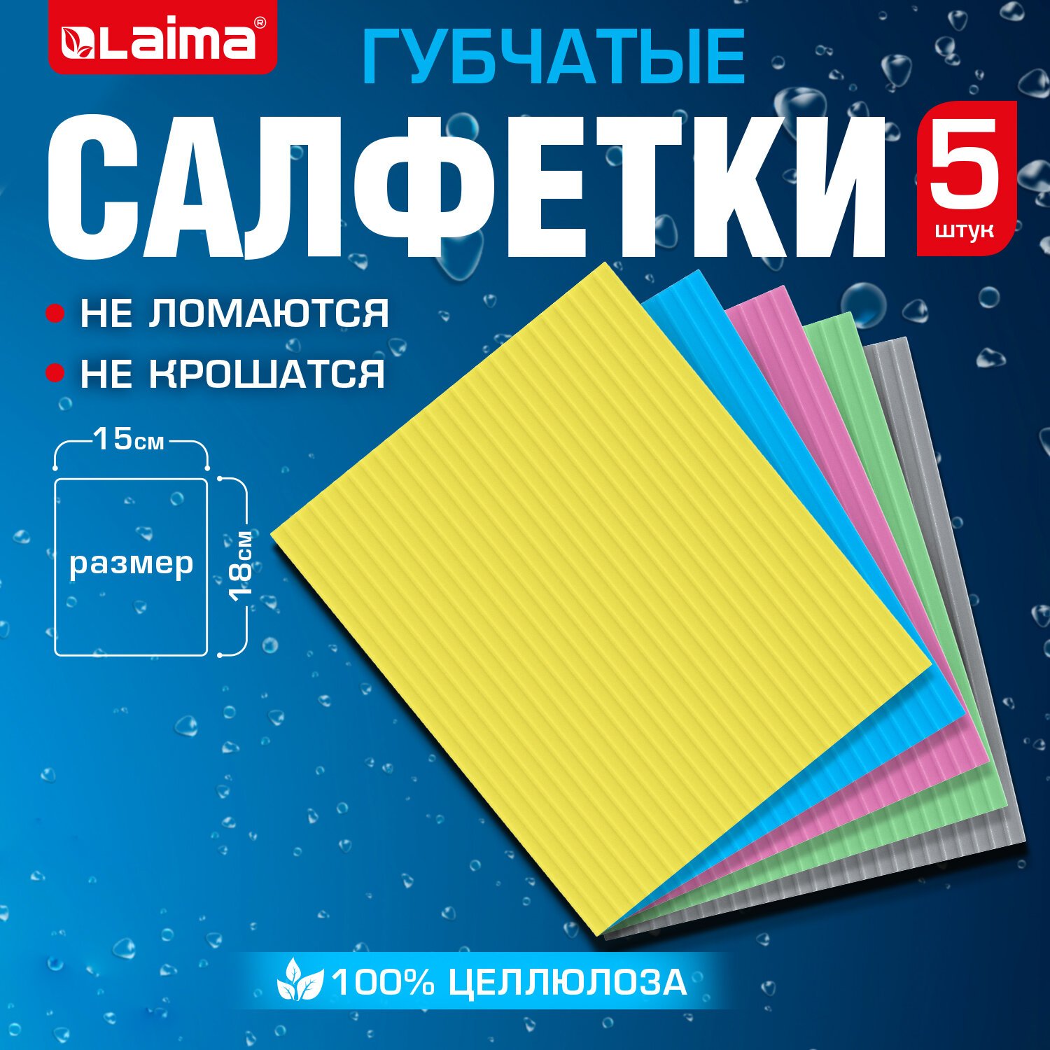 Салфетки губчатые для уборки кухни 15*18см ЦЕЛЛЮЛОЗНЫЕ, КОМПЛЕКТ 5шт, цветные, LAIMA, 700267