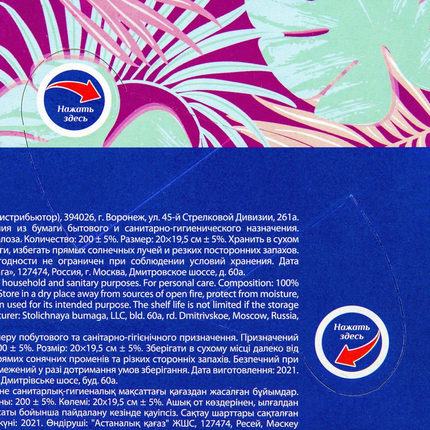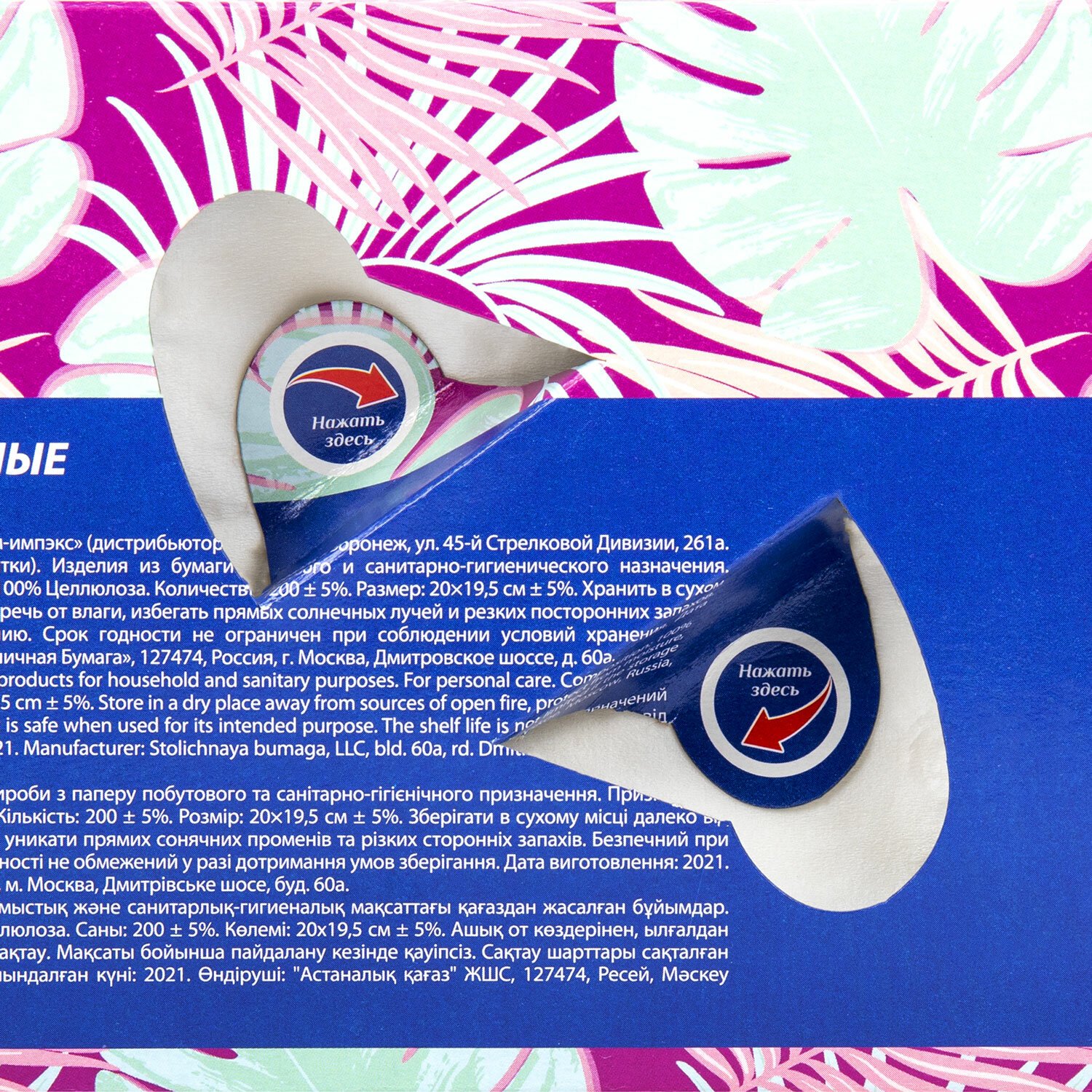 Салфетки практичны в применении. Извлекаются по одной через клапан на верхней стороне коробки. Пользоваться салфетками удобно и легко - кончик следующей салфетки всегда выступает из коробки. Для удобства на задней стороне пачки имеются два поддерживающих элемента для салфеток. Когда салфетки будут заканчиваться, и возникнет вероятность того, что при выдергивании салфетки кончик последующей не будет выступать из клапана, просто нажмите в двух обозначенных местах по перфорации и поднимите с помощью этих элементов оставшиеся салфетки ближе к клапану.