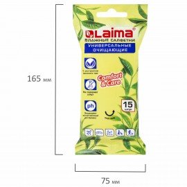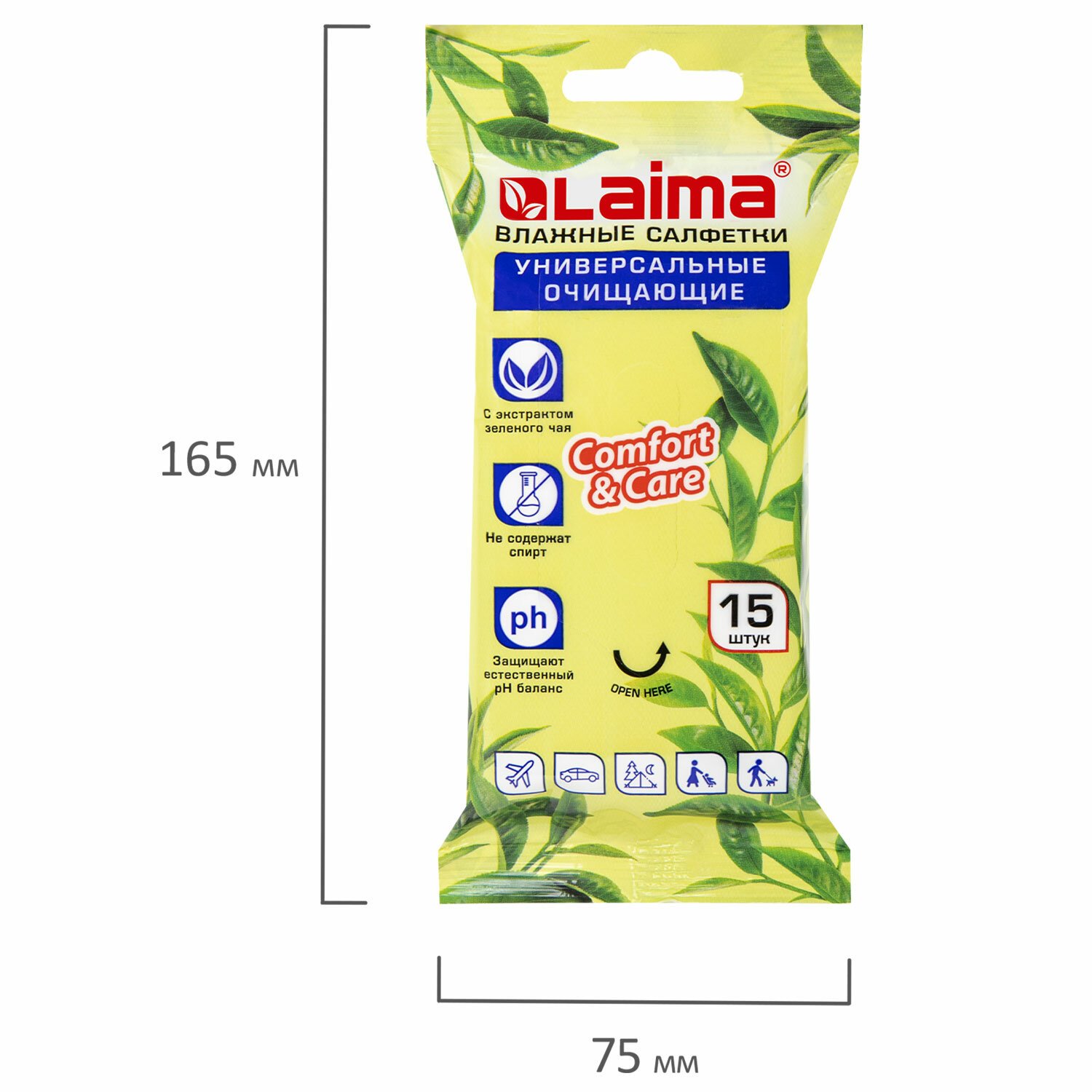 Салфетки влажные 15 шт., УНИВЕРСАЛЬНЫЕ, очищающие, с экстрактом зеленого чая, LAIMA, 125956