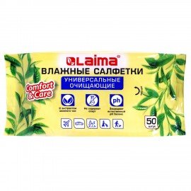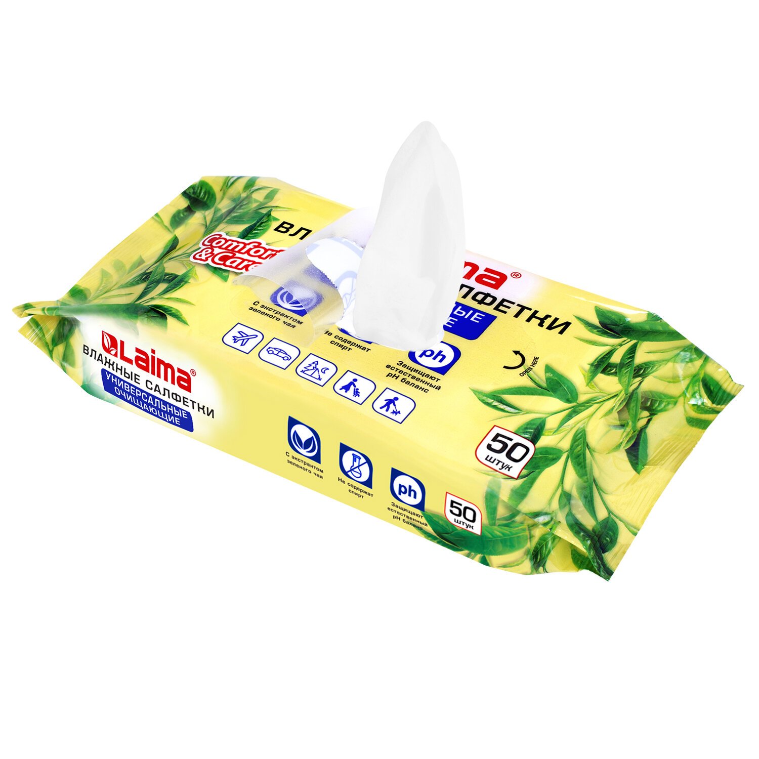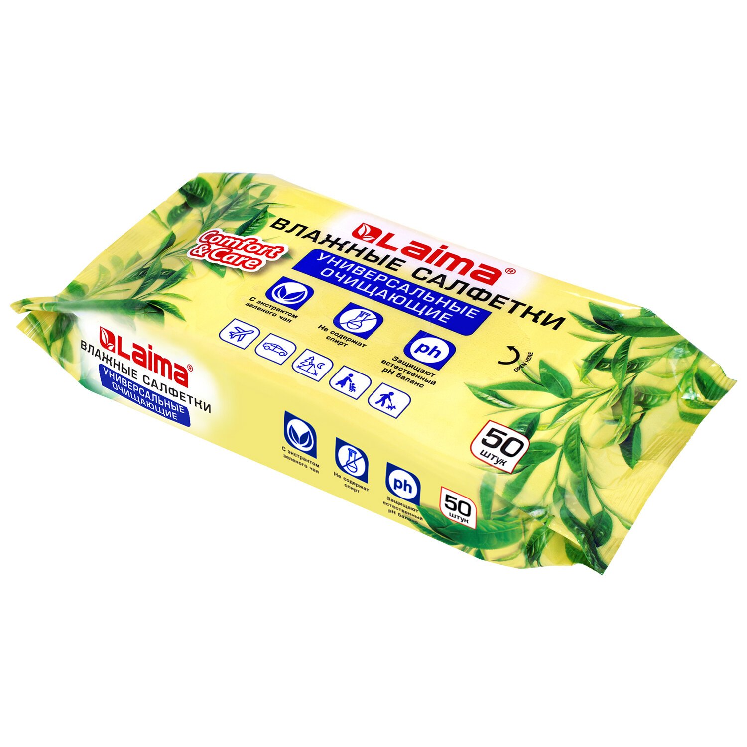 Салфетки влажные 50 шт., УНИВЕРСАЛЬНЫЕ, очищающие для всей семьи, экстракт зеленого чая, LAIMA,128077