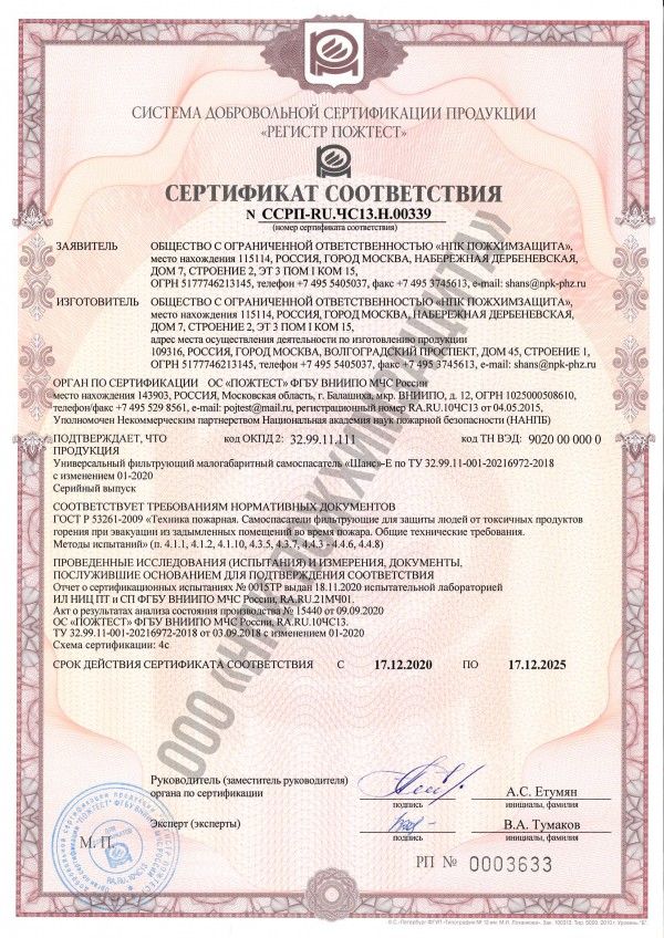 | Защитные свойства | от продуктов горения и химически опасных веществ |