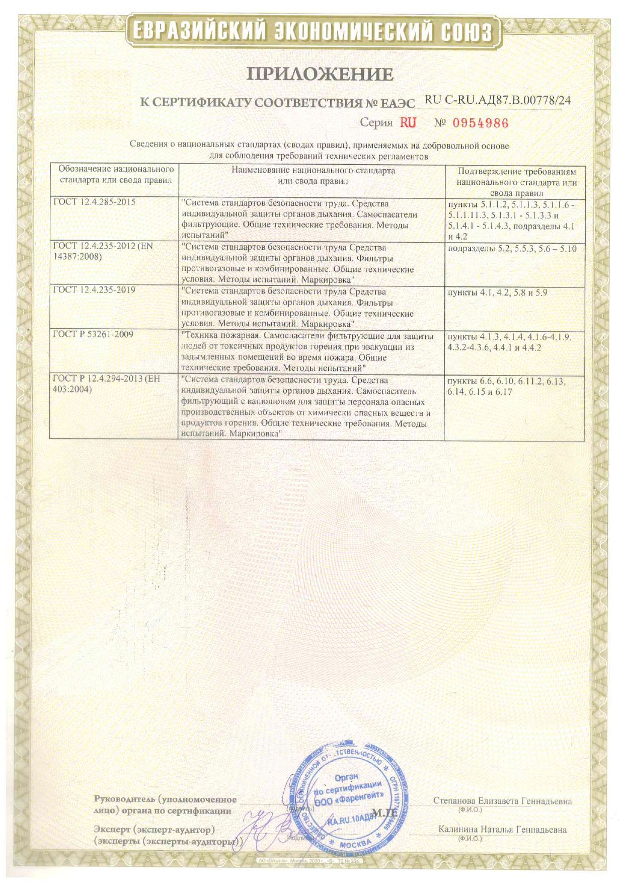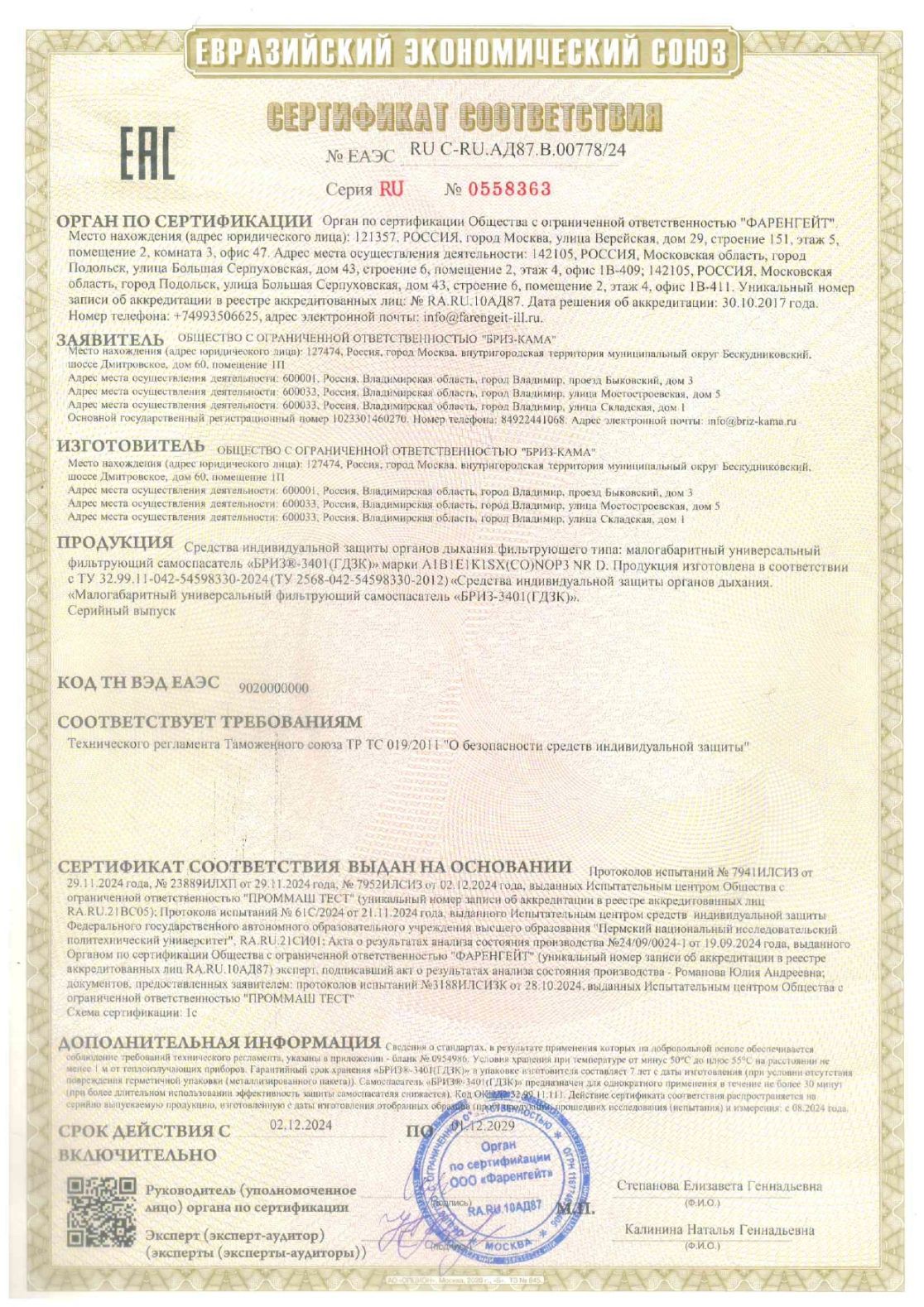 Самоспасатель БРИЗ®-3401 (ГДЗК) соответствует ГОСТ Р 53261-2009, ГОСТ Р 12.4.294-2013, ГОСТ 12.4.285-2015, ГОСТ 12.4.235-2019, которые обеспечивают соблюдение требований ТР ТС 019/2011. Имеет класс 3 – высокая эффективность по ГОСТ 12.4.285-2015 и среднюю эффективность по ТР ТС 019/2011. Самоспасатель БРИЗ®-3401 (ГДЗК) имеет заключение Министерства промышленности и торговли Российской Федерации о подтверждении производства средств индивидуальной защиты на территории РФ.