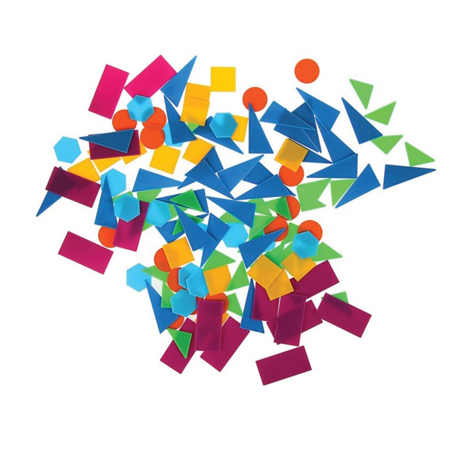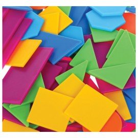 Дидактический материал для изучения геометрических фигур и основ счета в игровой форме. Содержит 120 элементов: прямоугольник — 15 шт., квадрат — 15 шт., круг — 15 шт., шестиугольник — 15 шт., треугольник 45° — 30 шт., треугольник 30° — 30 шт.