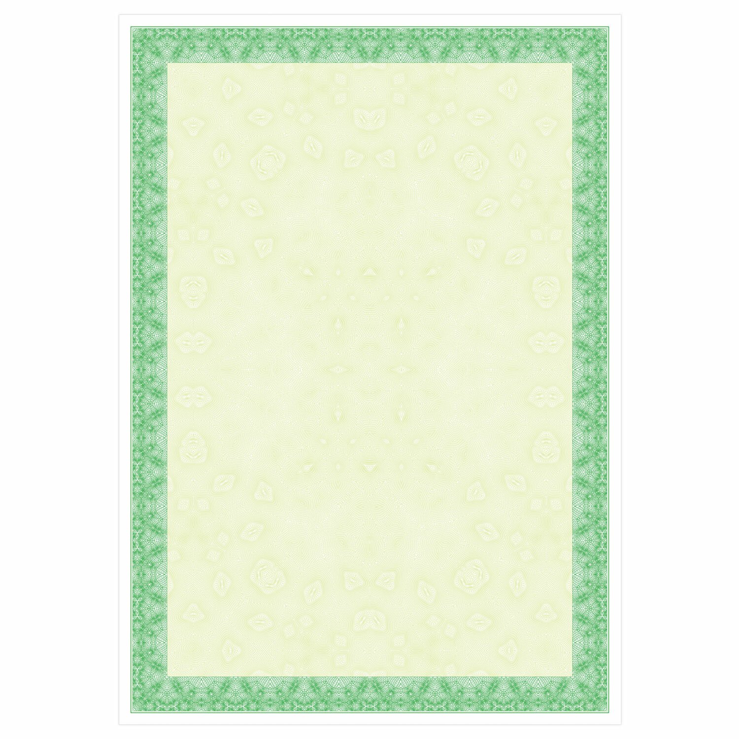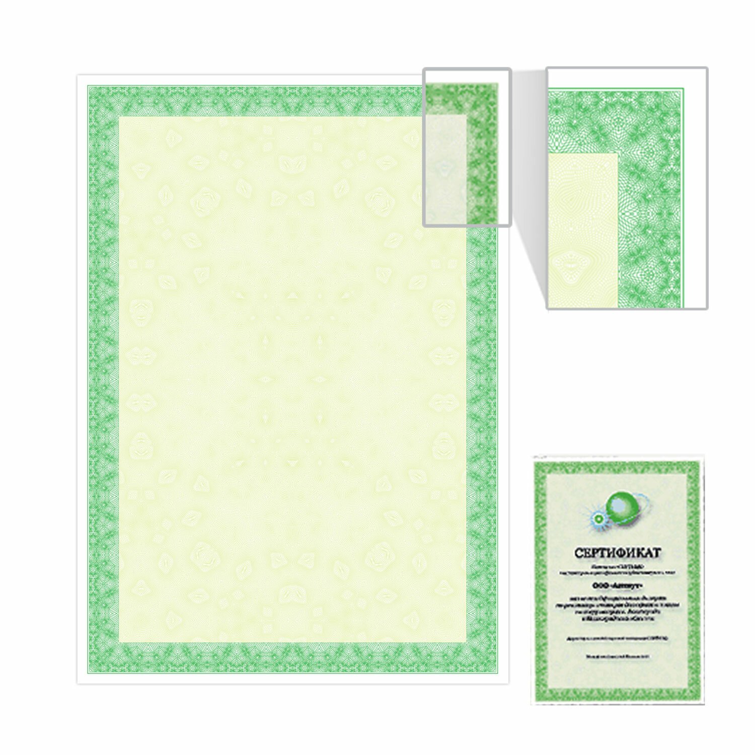 Бумага формата А4 (210х297 мм) выполнена из импортной мелованной бумаги плотностью 115 г/м2. Имеет вертикальную ориентацию. Микропечать защитит документ от копирования. Лицевая сторона украшена рамкой зеленого цвета. Поставляется по 25 листов в термоусадочной пленке.