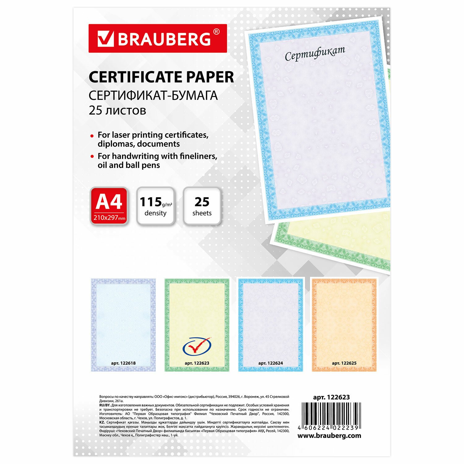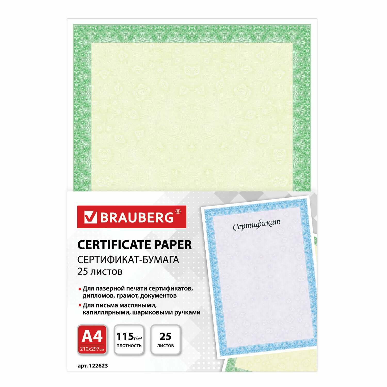 Сертификат-бумага для лазерной печати BRAUBERG предназначена для изготовления сертификатов, грамот, дипломов, памятных и других важных документов. Идеальна для письма масляными, капиллярными и шариковыми ручками.