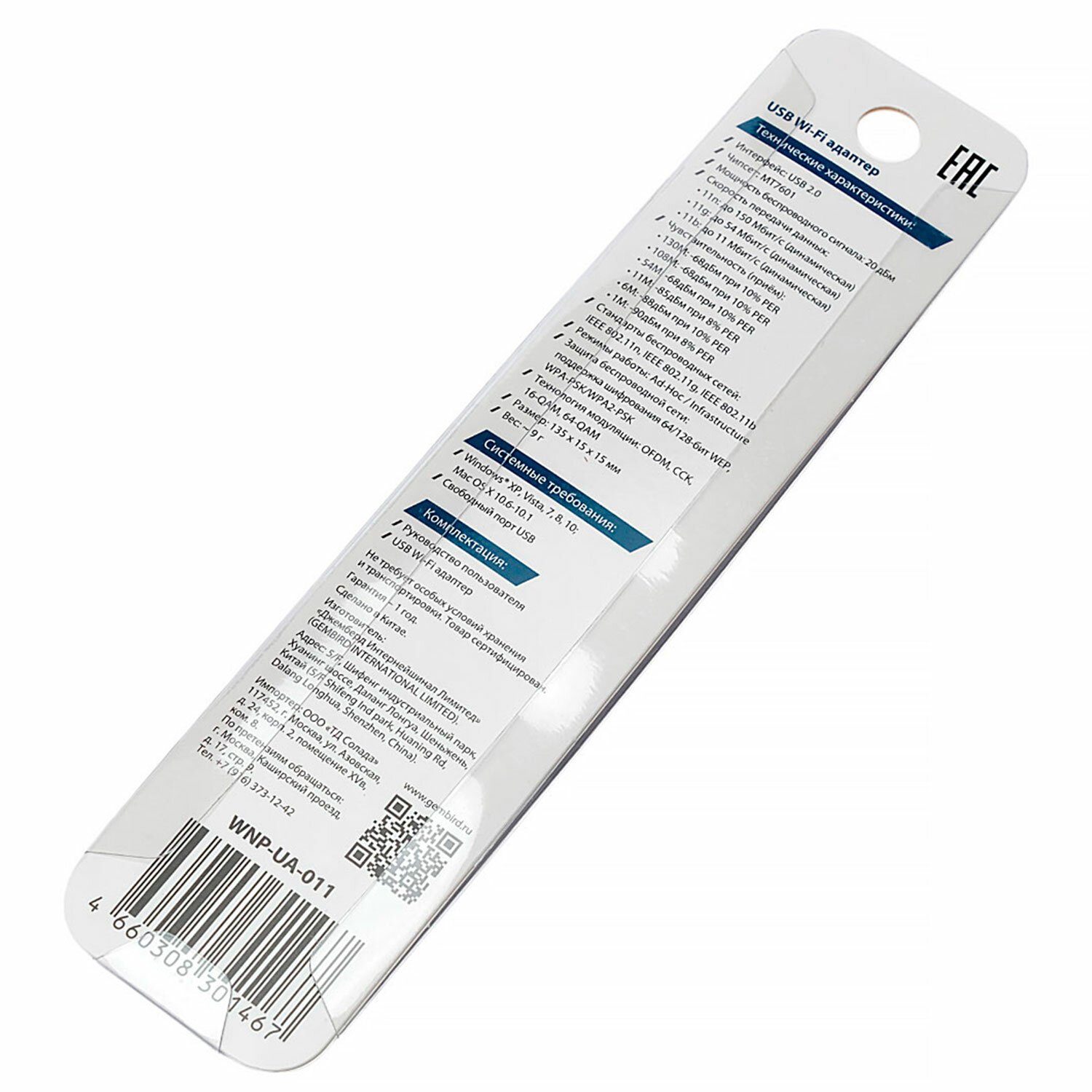 Сетевой адаптер WiFi GEMBIRD 150 Мбит, с антенной, USB, 802.11b/g/n, MT7601, WNP-UA-011