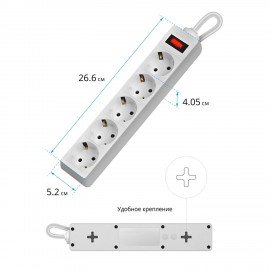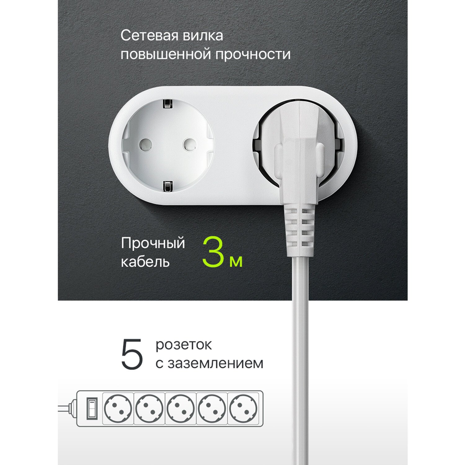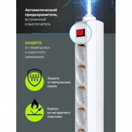 5 розеток, расположенных под углом, упростят подключение необходимого количества электротехники одновременно. Длина шнура составляет 3 м, максимальный ток нагрузки - 10 А, напряжение - 220 В, а частота напряжения - 50 Гц. Корпус выполнен из высококачественного, ударопрочного, негорючего пластика. Каждая розетка оборудована заземляющими контактами. Подобная защита исключает случайное поражение электрическим током, что особенно актуально, если в помещении, где используются электроприборы, есть дети. Стандартные размеры (277х53х40 мм) и вес (370 г) помогут с легкостью разместить сетевой фильтр.