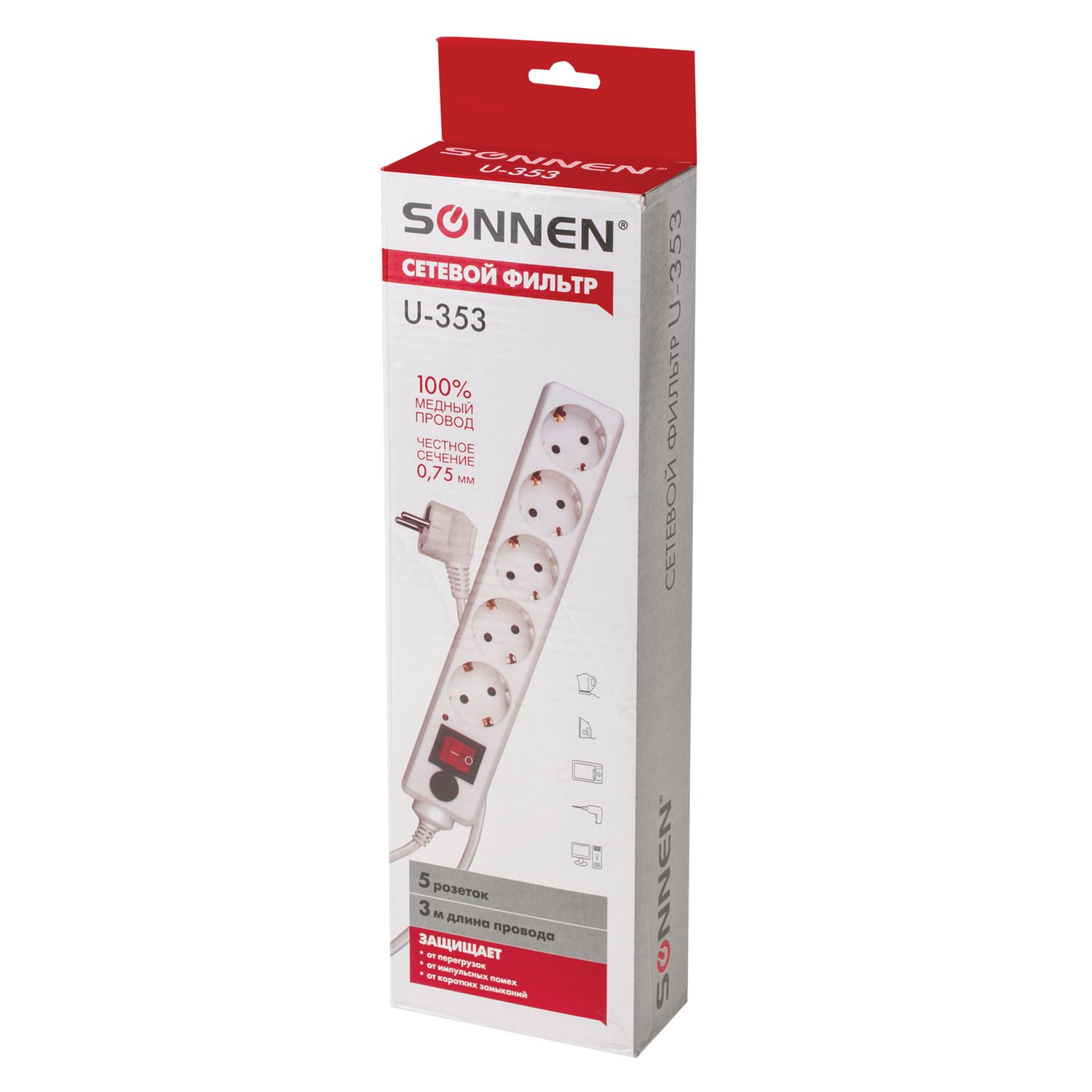 Сетевой фильтр SONNEN U-353, 5 розеток, с заземлением, выключатель, 10 А, 3 м, белый, 511425