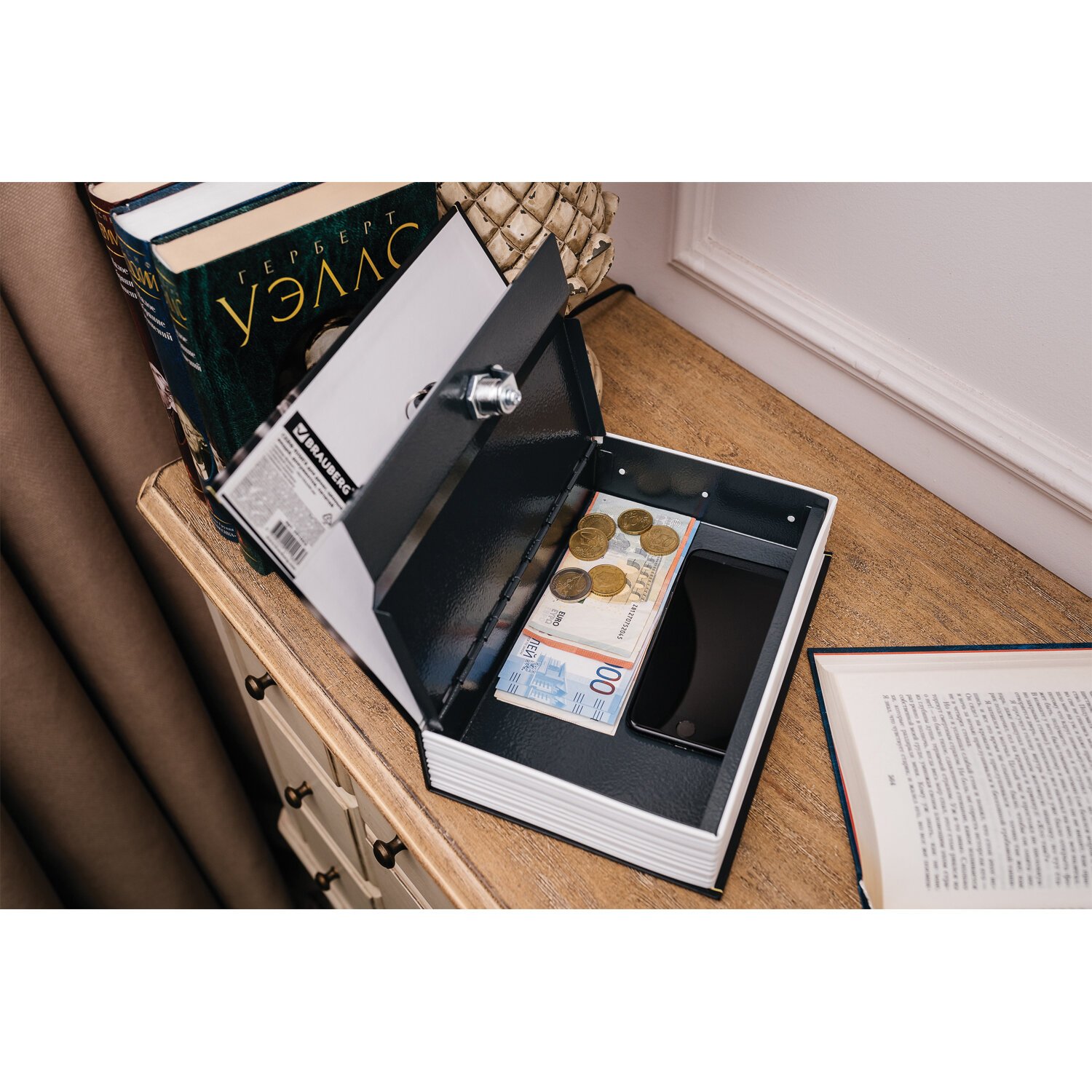 Ящик из прочной стали с ключевым замком BRAUBERG. Используется для ограничения доступа посторонних лиц. Незаметен на книжной полке дома и в офисе. Отлично подойдет в качестве подарка или сувенира.