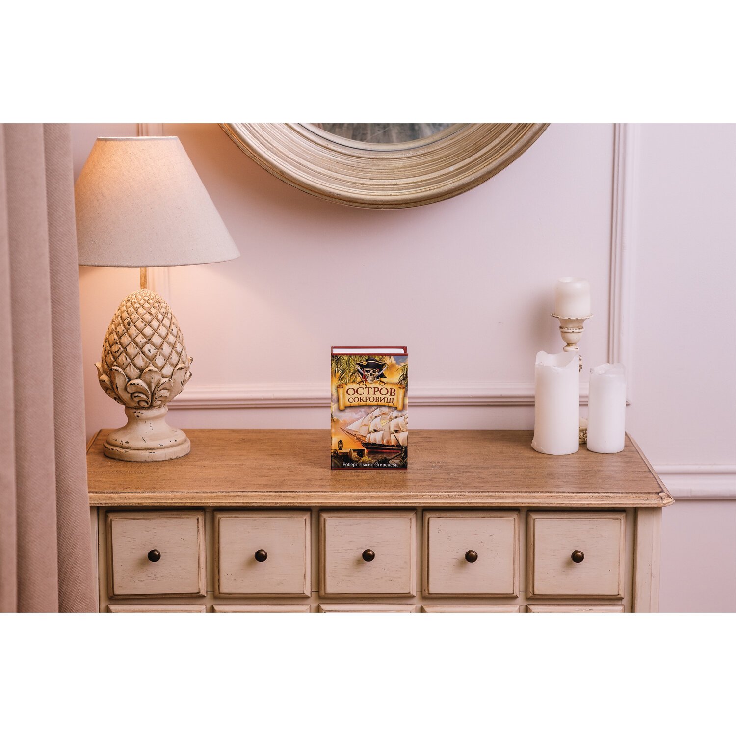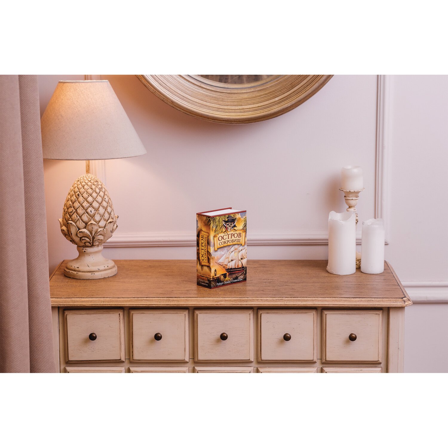 Ящик стилизован под книгу "Остров сокровищ". Книга-сейф — это металлический бокс в виде ложной книги. Предназначен для хранения мелких ценных вещей: документы, медикаменты, печати, мелкая наличность. Оригинальный, удобный бокс, который можно использовать как тайничок: бокс маскируется под книжку, незаметен среди других книг на полке. Главная особенность такой вещи в том, что выглядит она весьма оригинально, благодаря чему нравится многим. Фраза "Книга - лучший подарок" еще никогда не была так актуальна.