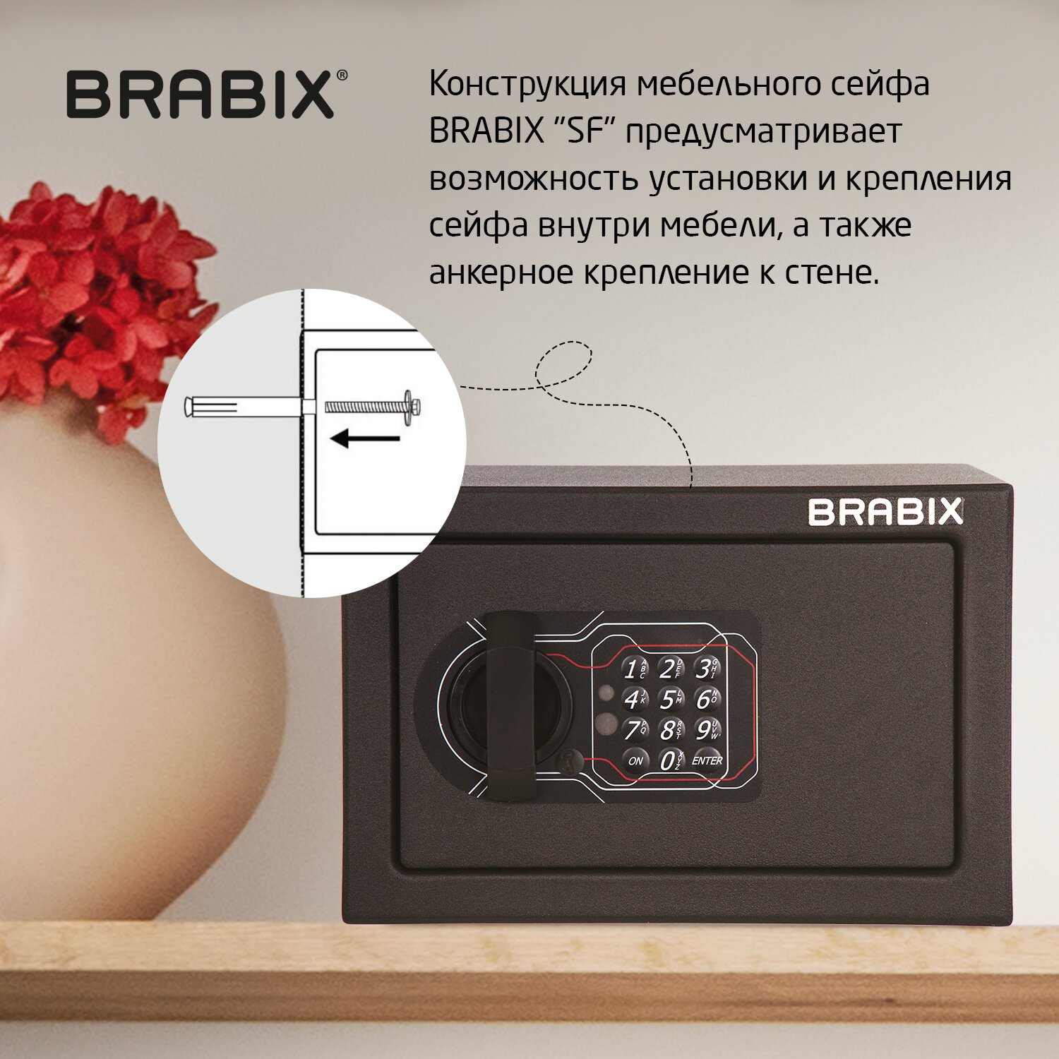 Конструкция мебельного сейфа BRABIX "SF" предусматривает возможность установки и крепления сейфа внутри мебели, а также анкерное крепление к стене.