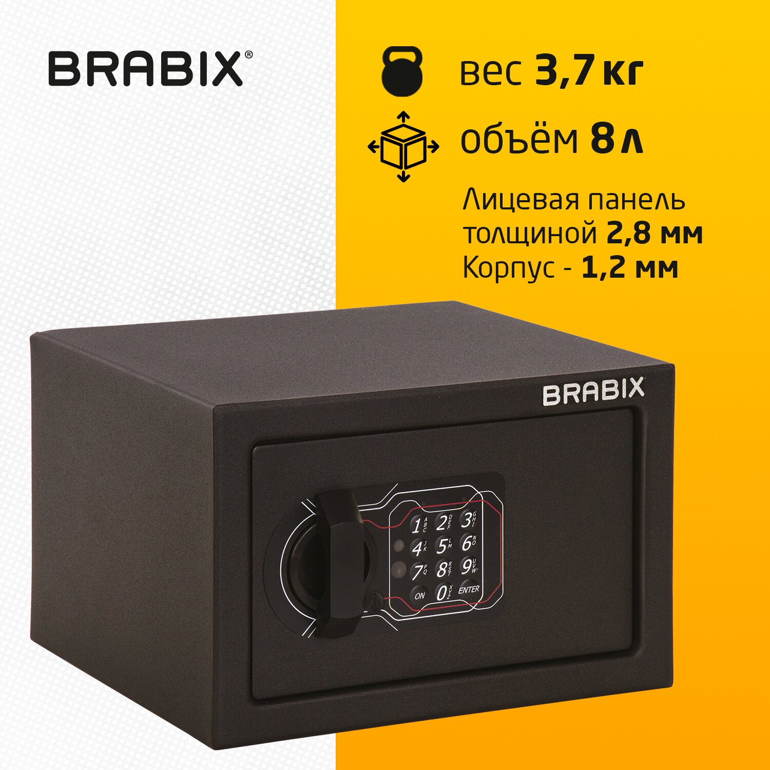 Сейф изготовлен из стали. Лицевая панель толщиной - 2,8 мм, боковые - 1,2 мм.