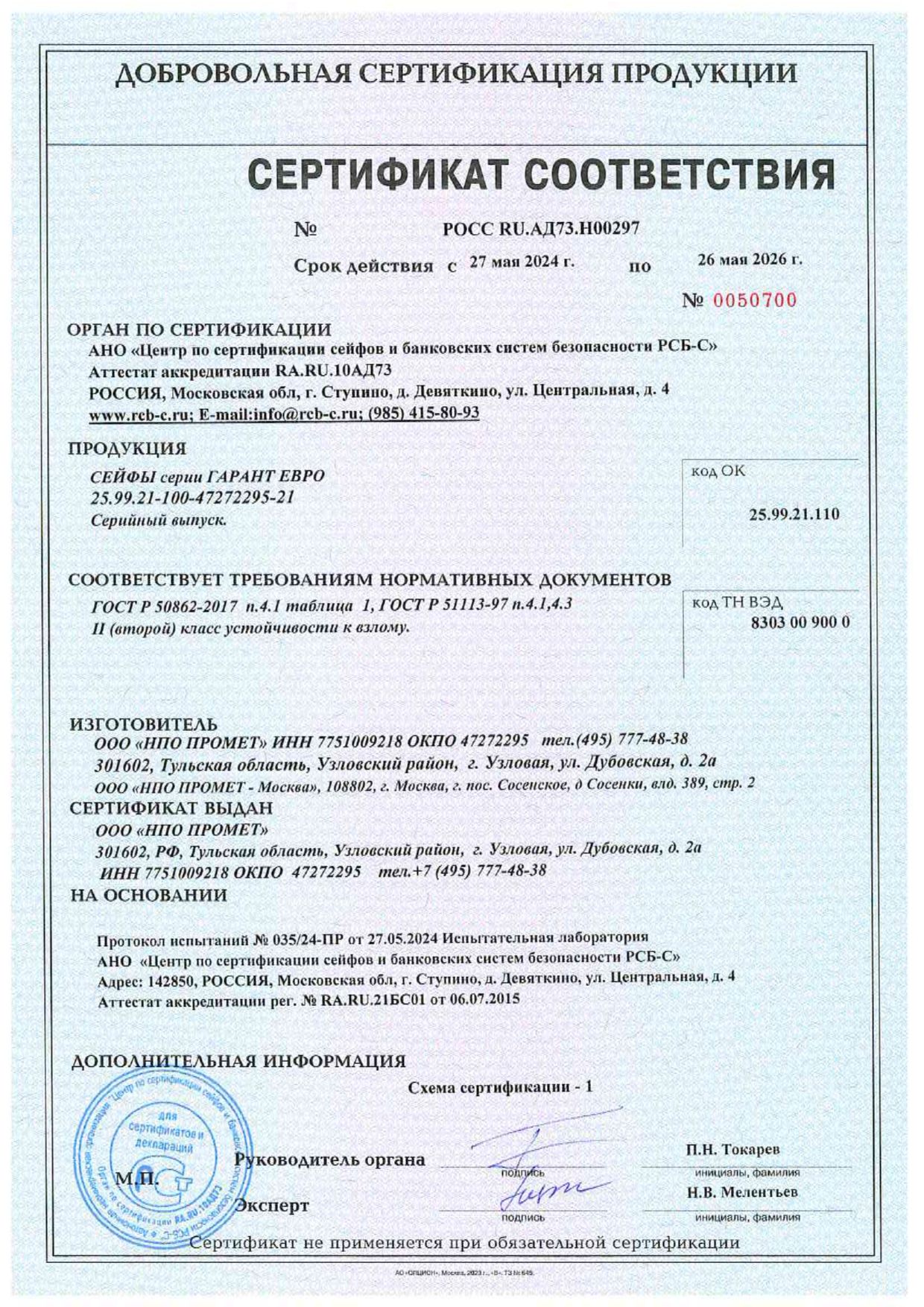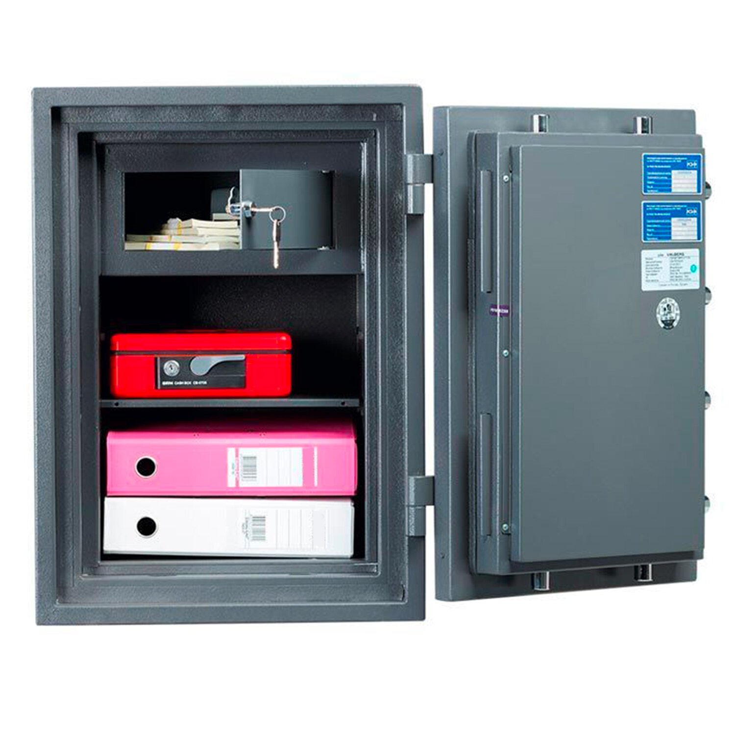 Предназначен для сохранности документов и ценностей при пожаре и взломе. Рекомендованная сумма хранения денег - до 6.5 млн. руб. для физических лиц и до 2 млн. руб. для юридических лиц. Устойчивость к взлому по ГОСТ Р 50862-2017: класс 2 (ГОСТ Р). Огнестойкость: ГОСТ Р 57384-2017: класс 60Б (ГОСТ Р)