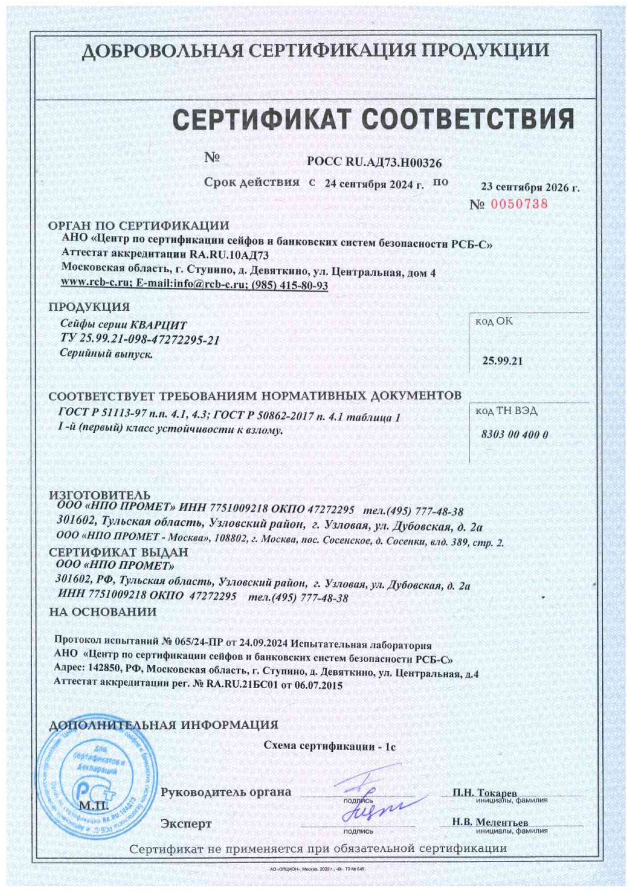 Предназначен для защиты документов и ценностей от несанкционированного доступа (взлома). Рекомендованная сумма хранения денег до 1 млн. руб. для физических лиц. Устойчивость к взлому: ГОСТ Р 50862-2017 - класс 1 (ГОСТ Р).