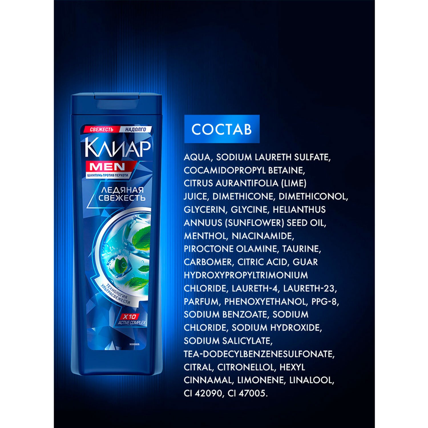 Шампунь против перхоти CLEAR MEN "Ледяная свежесть" эффективно берется с перхотью, увлажняет и питает кожу головы, сохраняя ощущение свежести надолго. Подходит для ежедневного применения.